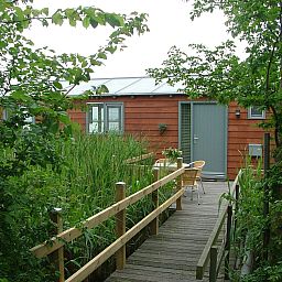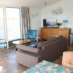 The terrace on the west side has a view of the lake and the terrace on the south side is sheltered by reeds. In the evening, you can enjoy the sunset. There is a sliding door to the terrace. The large windows offer a beautiful view of the wide water. There is parking space for your car in the campsite car park. There is something special about holidays on a houseboat.