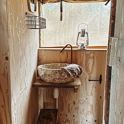 Le Tent Cottage est prévu pour 2 à 4 personnes, avec un grand lit double et un lit superposé. Une kitchenette avec réfrigérateur et plaque de cuisson à induction. Cuisine extérieure avec 3 pattes et une batterie de casseroles. Points d'électricité et d'éclairage disponibles. Douche extérieure avec eau chaude. Bain à remous en option