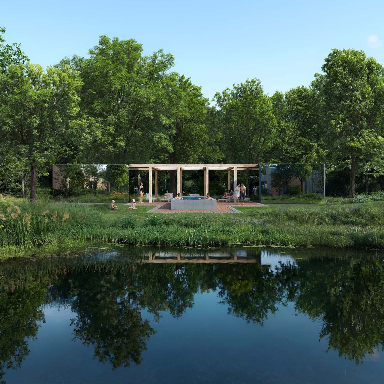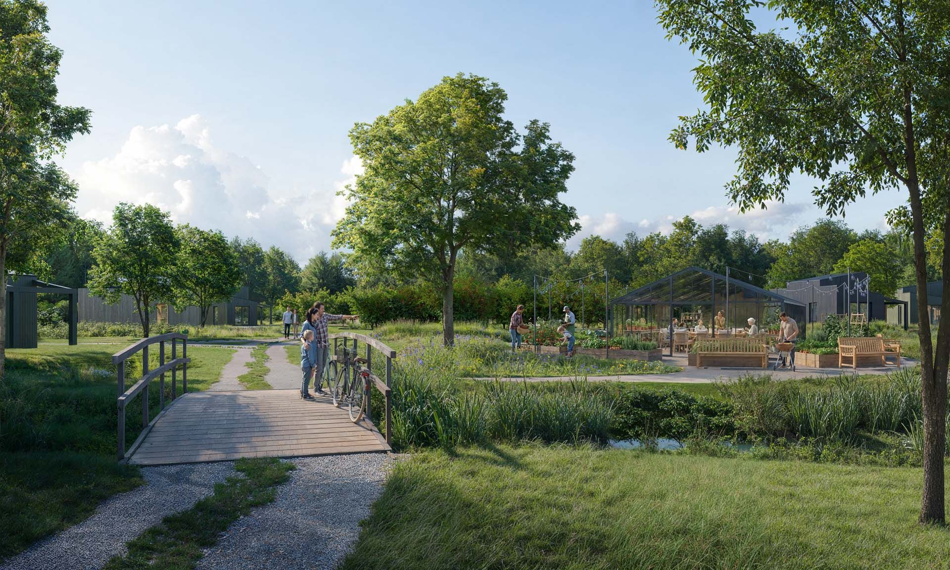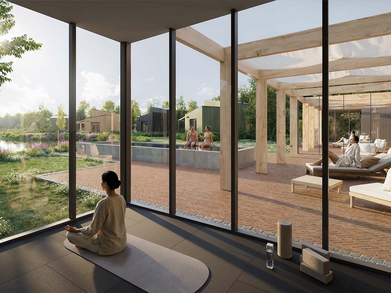 Het resort zelf is kleinschalig en omvat circa 35 eco-lodges. In het hart van het park ligt een vijver met wadi voor natuurlijke wateropvang. Binnenplaatsen en hofjes zijn geïnspireerd op historische kasteeltuinen met eetbare planten, fruitbomen en kruiden. Het resort is voorzien van een wellness met gym, finse sauna en turkse sauna, dipping pool, restaurant met zonnig terras en uitzicht over het Landgoed en de golfbanen. Alles is ontworpen vanuit één integrale landschapsvisie waarin natuur, waterbeheer en verblijfskwaliteit samenkomen.