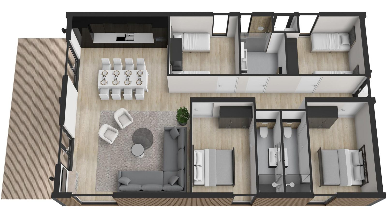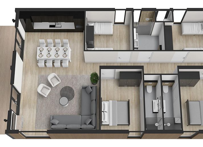 Profitez d'un moment de tranquillité à plusieurs dans le Bos Cube pour 8 personnes, où confort et espace sont les maîtres mots. Cette maison de 125 m² offre un salon lumineux avec climatisation, télévision à écran plat et Wi-Fi gratuit. La cuisine ouverte est entièrement équipée d'appareils modernes, notamment d'une plaque à induction, d'un four à micro-ondes combiné, d'une machine à café et d'un lave-vaisselle, parfaits pour passer d'agréables soirées. Avec quatre chambres, dont deux avec de grands lits boxspring, et trois salles de bains élégantes, tout le monde dispose de suffisamment d'espace et d'intimité. À l'extérieur, la grande terrasse vous invite à passer des moments de détente en plein air, entouré de verdure.