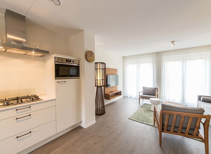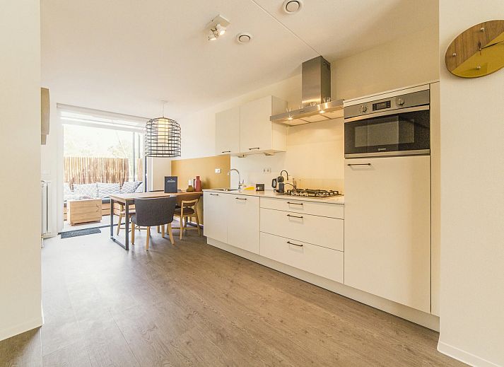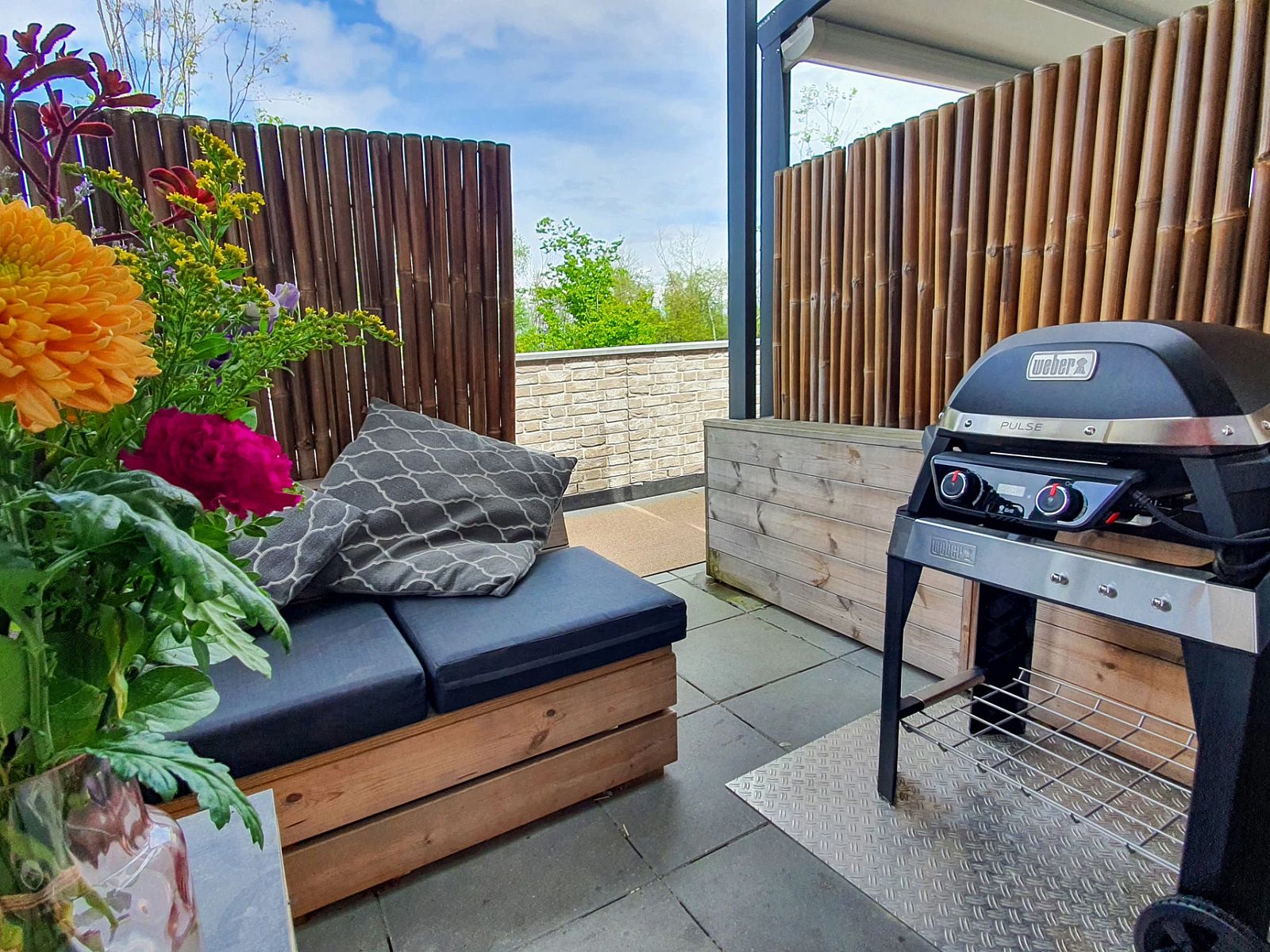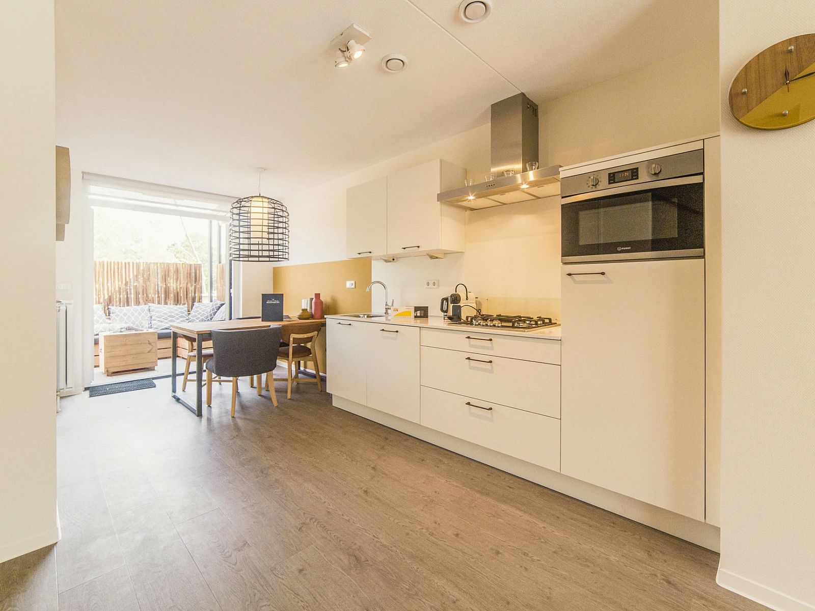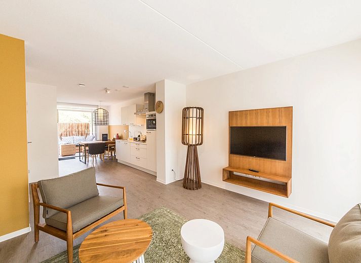 De royale woonkamer is ingericht met een comfortabele zithoek en eethoek en staat in verbinding met de open keuken die is voorzien van luxe inbouwapparatuur. Via de schuifdeuren bereikt u het overdekte terras met heater, elektrische barbecue en loungebank, een fijne plek om het hele jaar door buiten te zitten.