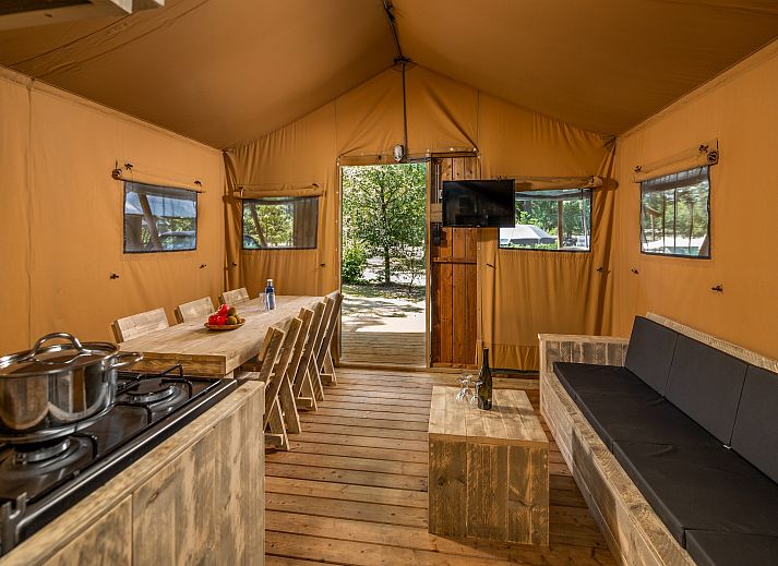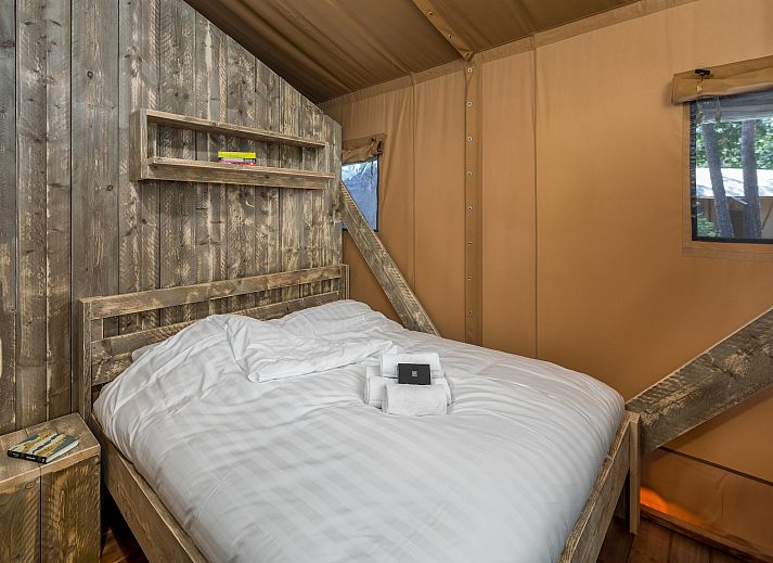 La tente-safari vous offrira le sentiment de faire du camping de luxe, connu sous le nom de glamping : vous y profitez en effet de l'ambiance d'une tente, avec une petite touche de confort supplémentaire. Dans le salon, vous trouverez une télévision. La cuisine ouverte comprend un réfrigérateur avec un compartiment congélateur. Il y a deux chambres à coucher, dont une avec un lit double et l'autre avec deux lits surposées. La salle de bain comprend une douche et des toilettes.