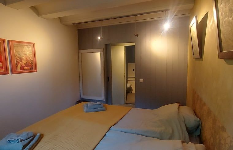 La chambre dispose de deux lits à ressorts séparés et la salle de bains est reliée à la chambre.