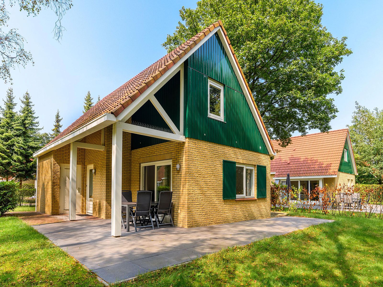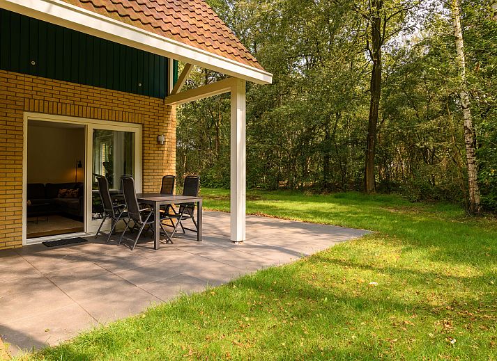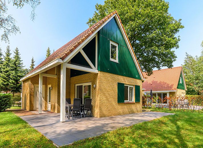 De bungalow heeft een terras met tuinmeubilair en een parasol, een inpandige berging en een traphekje.