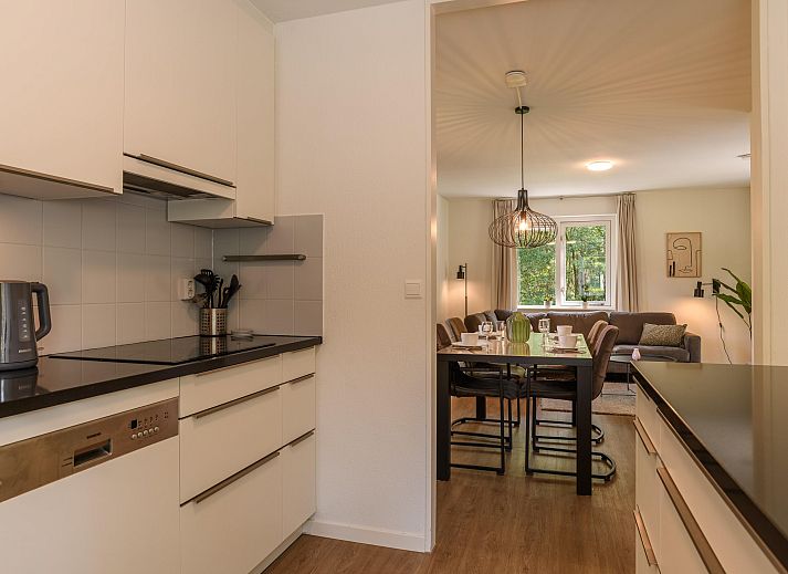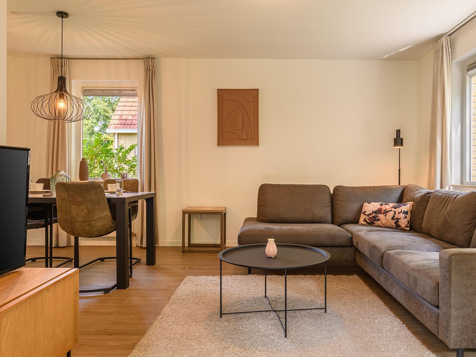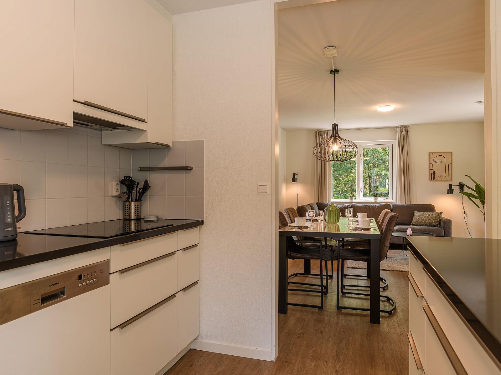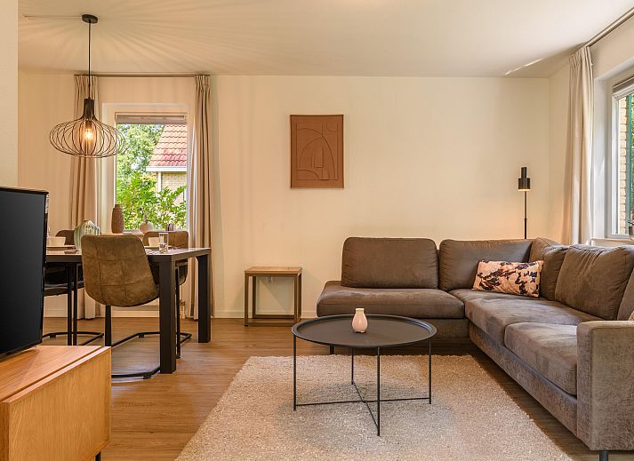 De woonkamer is ingericht met een zithoek, een televisie met streamingsmogelijkheden en grenst aan de open keuken met eethoek. De keuken is voorzien van onder andere een koelkast met vriesvak, magnetron, Senseo apparaat, filterkoffiezetapparaat en een vaatwasser.