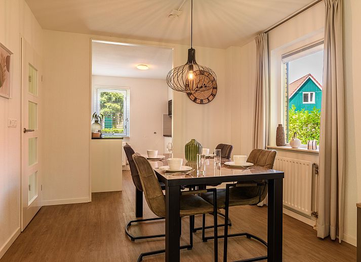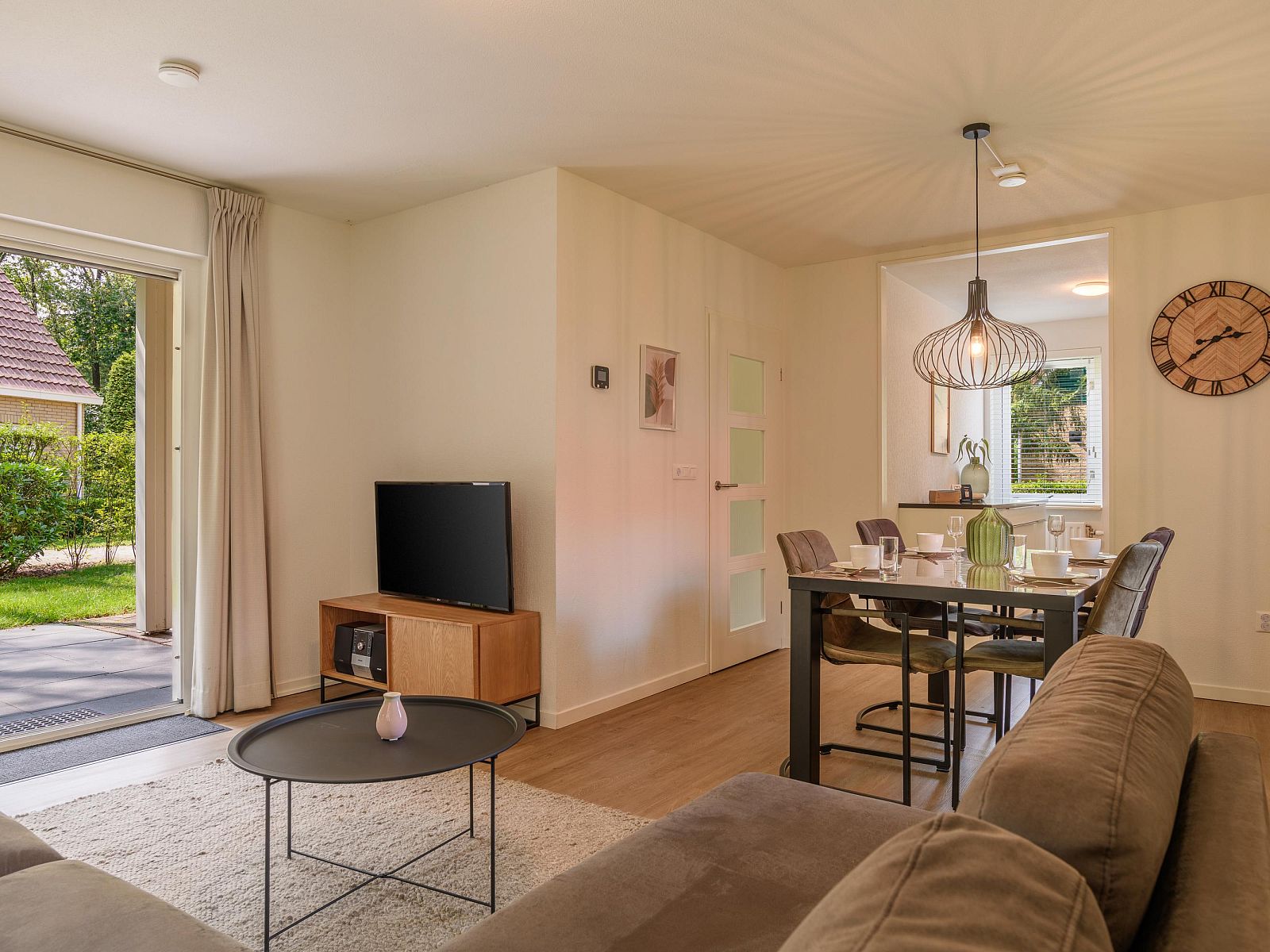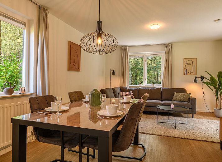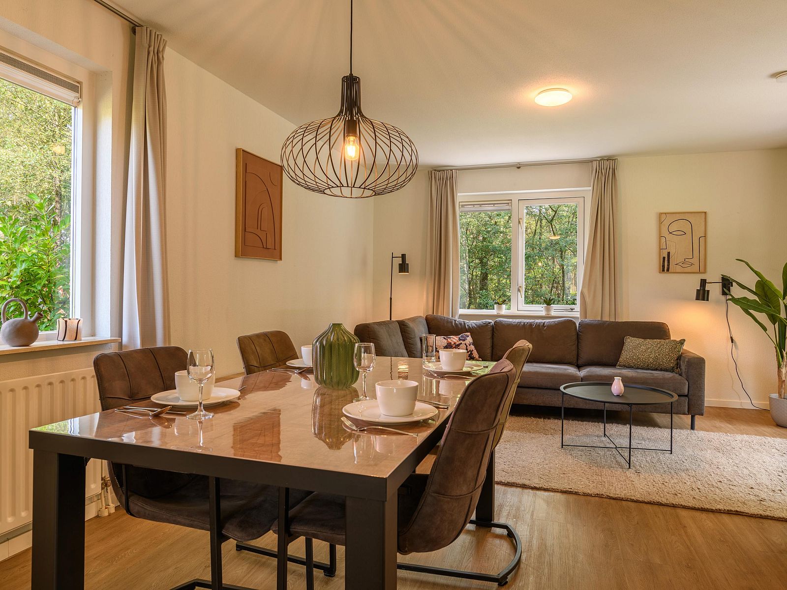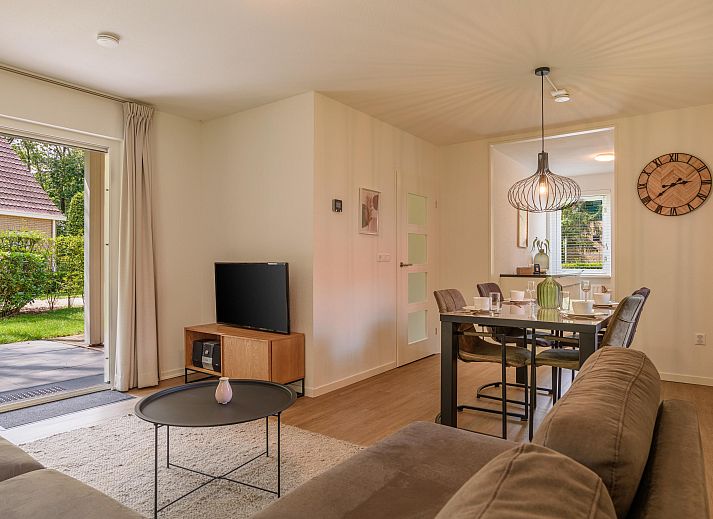 De woonkamer is ingericht met een zithoek, een televisie met streamingsmogelijkheden en grenst aan de open keuken met eethoek. De keuken is voorzien van onder andere een koelkast met vriesvak, magnetron, Senseo apparaat, filterkoffiezetapparaat en een vaatwasser.