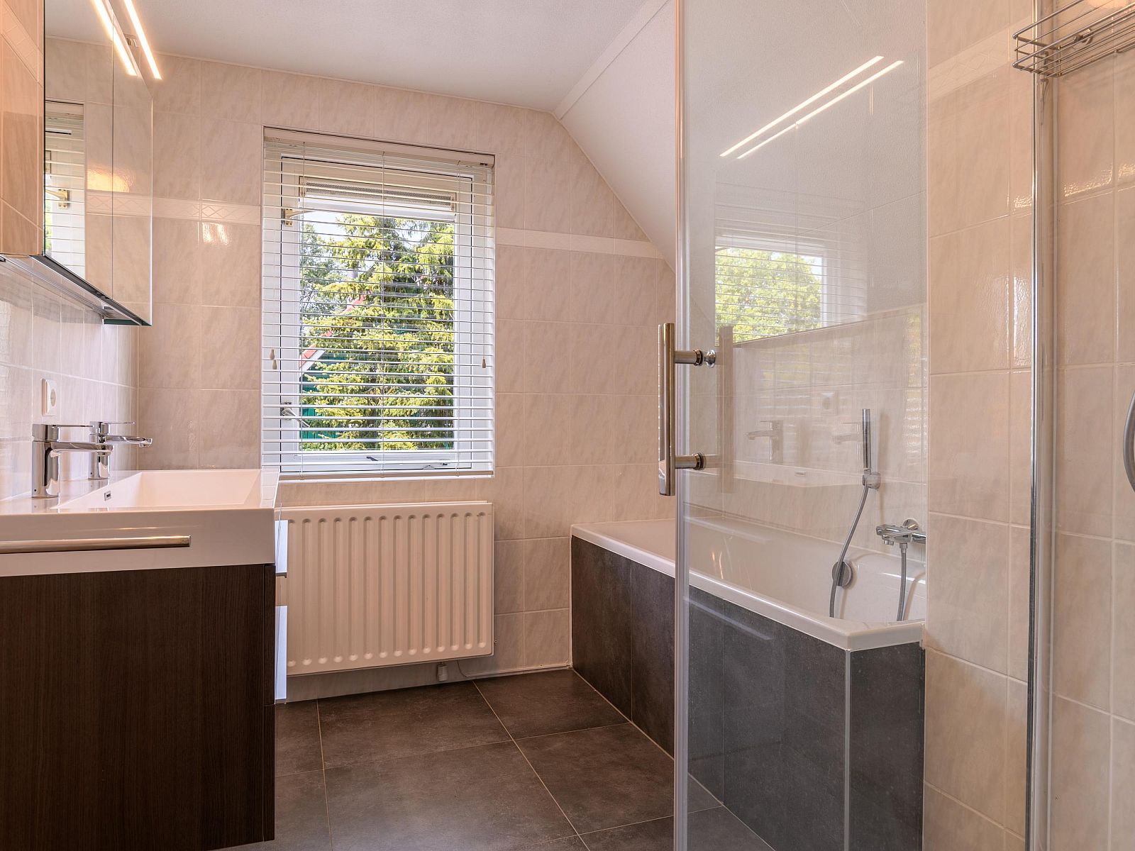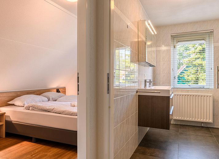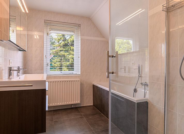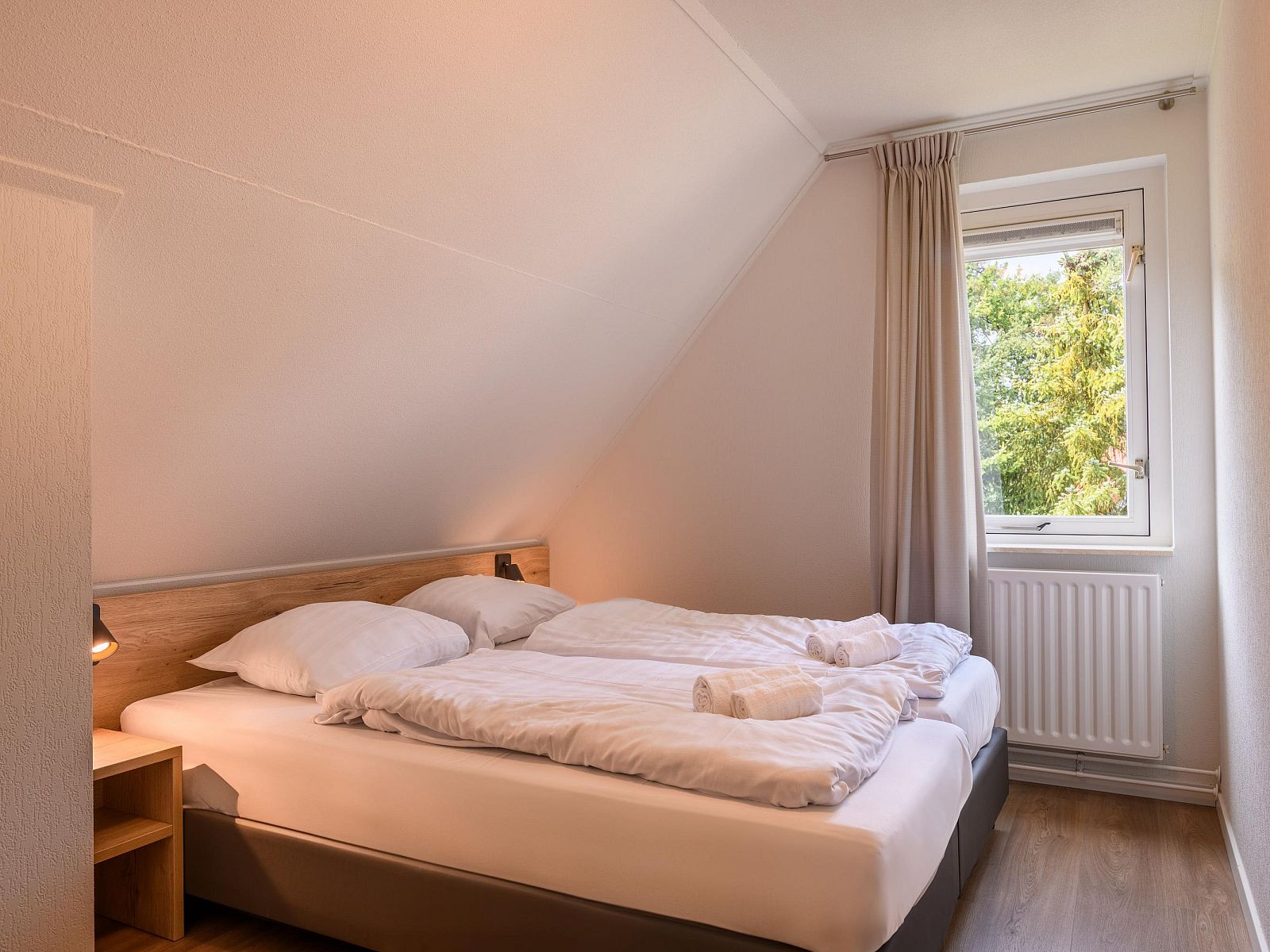 Op de eerste verdieping bevinden zich 2 slaapkamers met elk 2 éénpersoons boxsprings. De badkamer heeft een ligbad, douche en wastafel. Er is ook een houten kinderledikant aanwezig en een apart toilet.