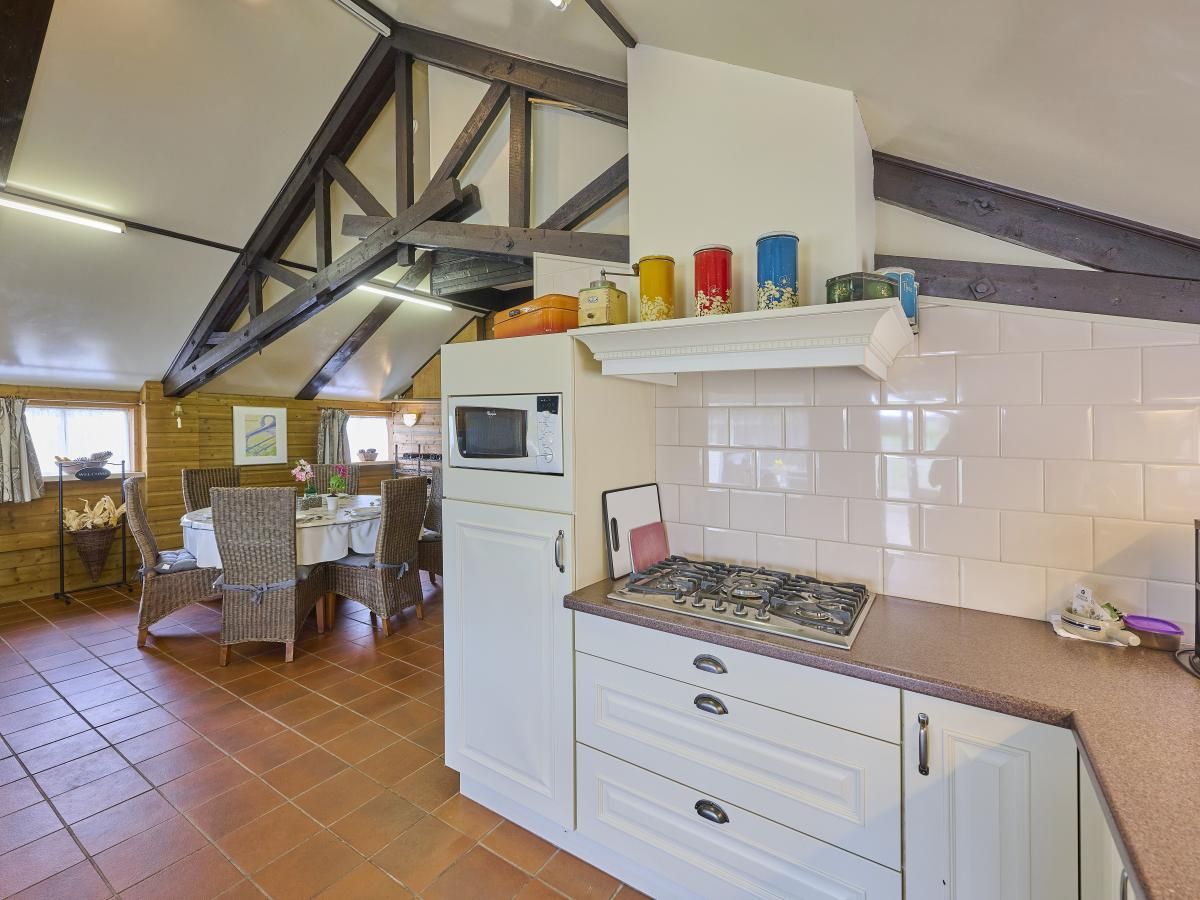 Rez-de-chaussée: cuisine ouverte avec radio, bouilloire, cuisinière(gaz), cafetière(filtre), four, micro ondes, lave-vaisselle , réfrigérateur, congélateur , séjour/salle à manger avec TV, table, coin salon , chambre avec 2x lit simple , chambre avec lit double , salle de bain avec douche, 2x lavabo, WC