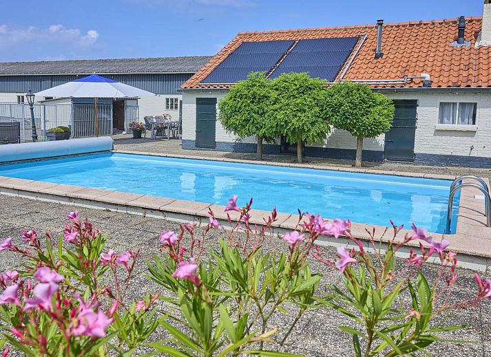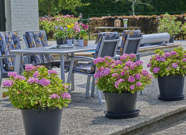 terrasse, jardin(clôturé), mobilier de jardin, chaises longues, parasol, piscine(chauffable, ouvert de Mai jusqu'à (inclus) mi-Sept)