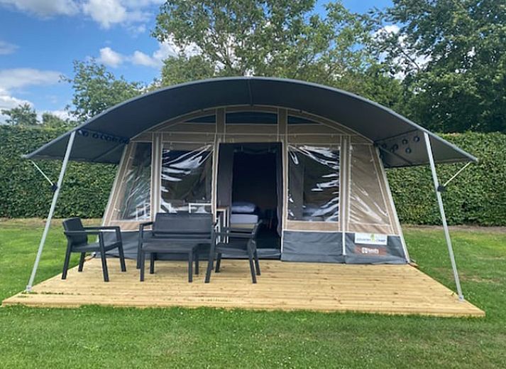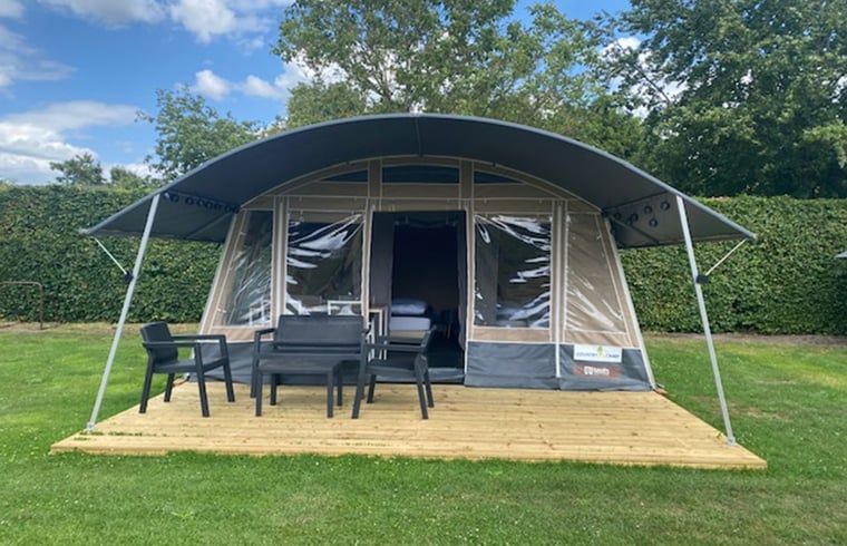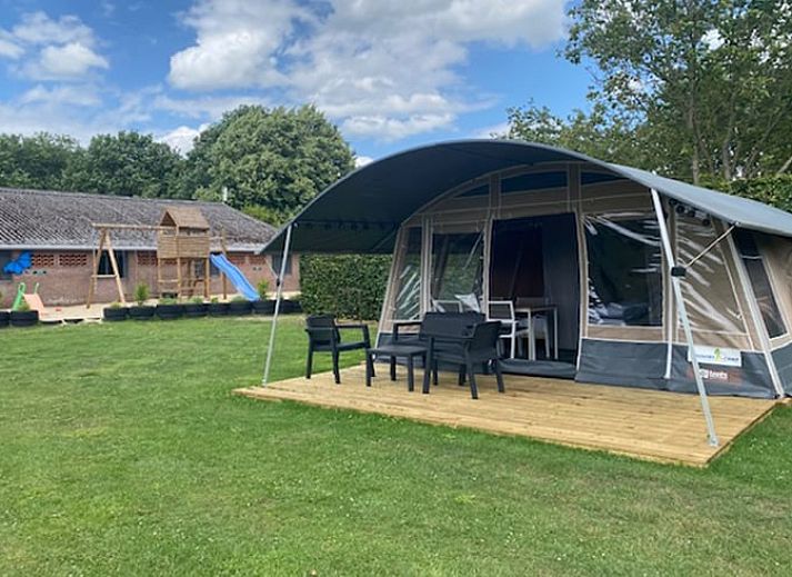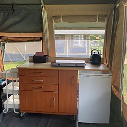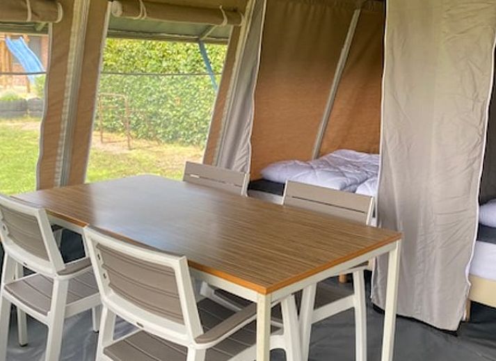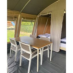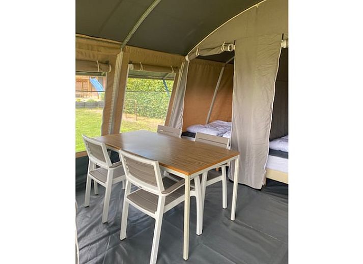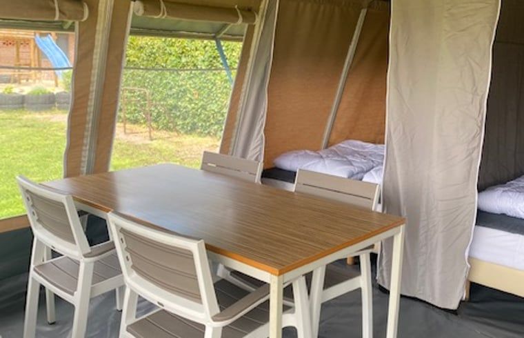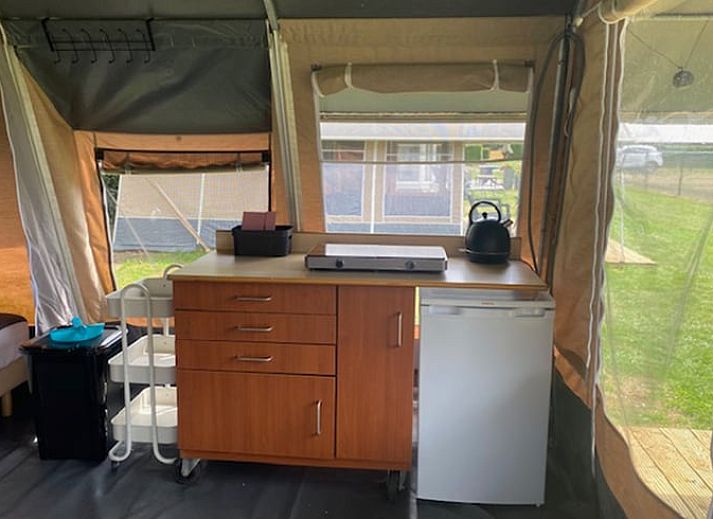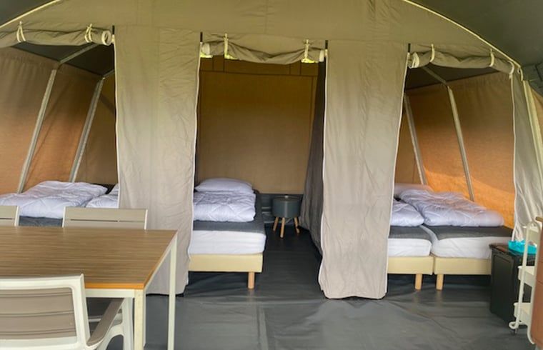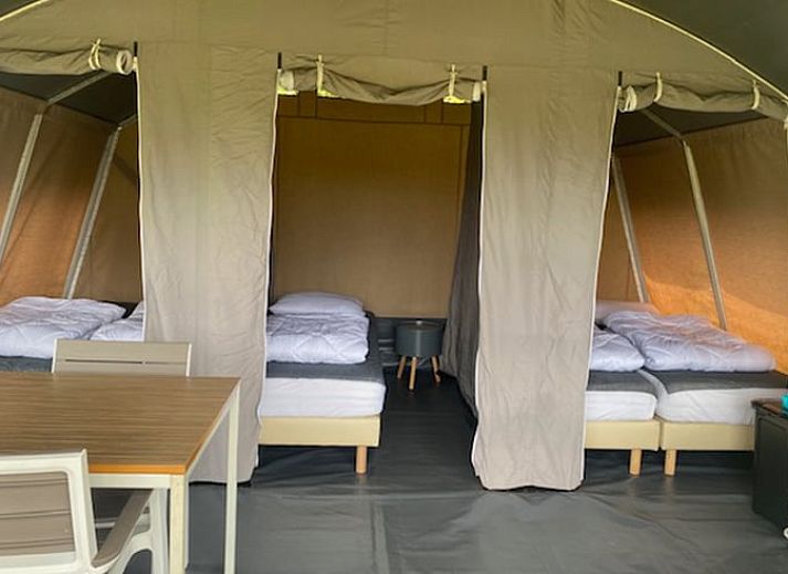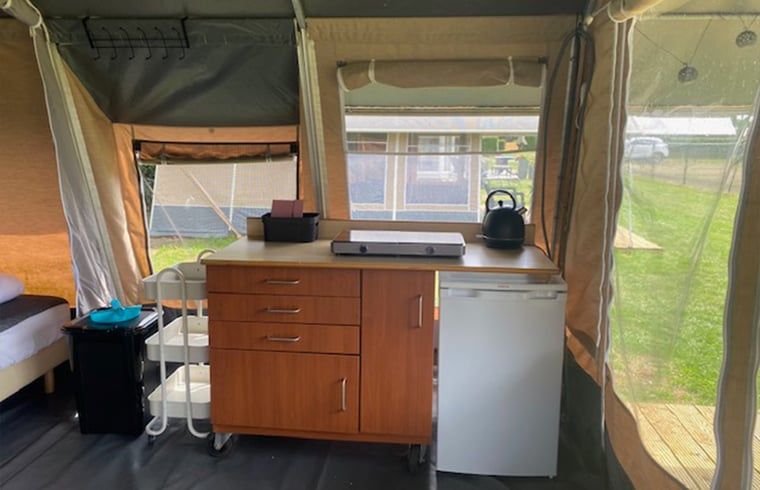 À l'intérieur, vous trouverez un salon confortable avec un coin cuisine complet, équipé de vaisselle, d'ustensiles de cuisine, d'une plaque à induction et d'une bouilloire. Tout ce dont vous avez besoin pour cuisiner facilement est à votre disposition. La tente lodge dispose de trois cabines séparées : deux cabines avec chacune deux lits simples et une cabine avec un lit simple. Ainsi, chacun a son propre espace et la tente reste claire et confortable.