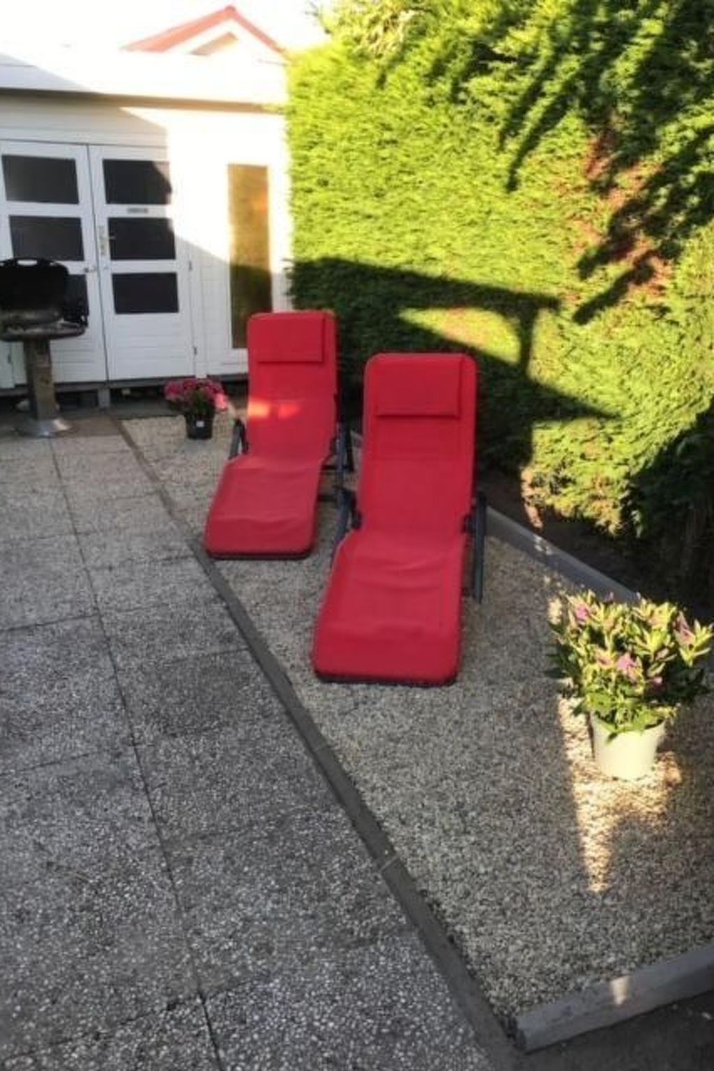 Table with 4 chairs, 2 sun loungers, parasol, small sandpit, parking space for bicycles