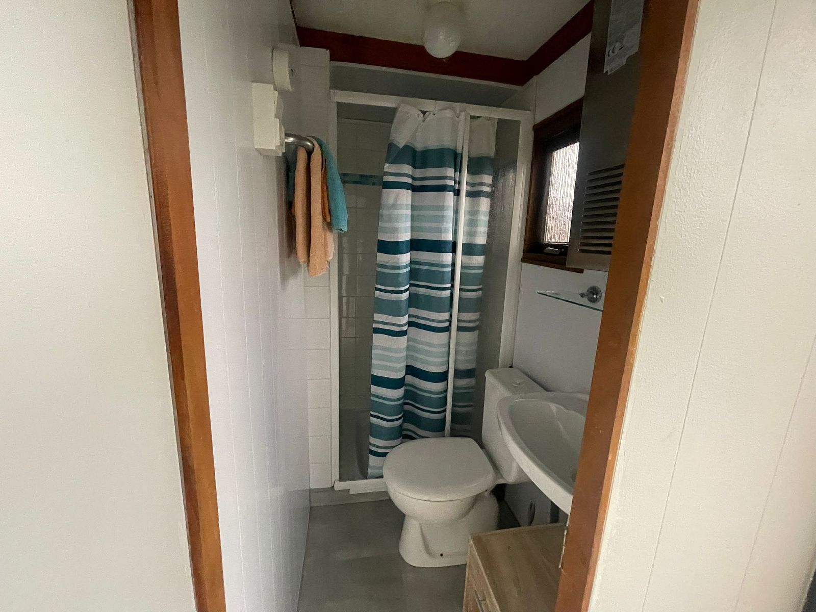 La salle de bain est équipée d'une douche spacieuse, d'un lavabo et d'un WC.