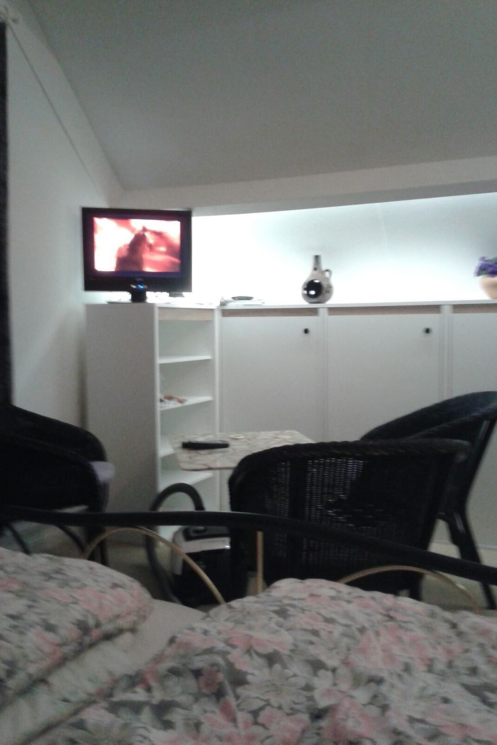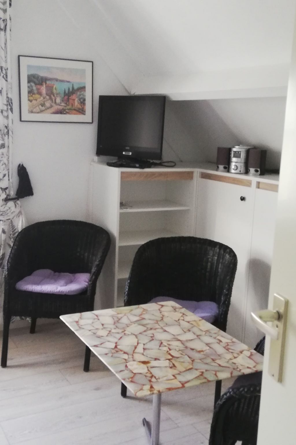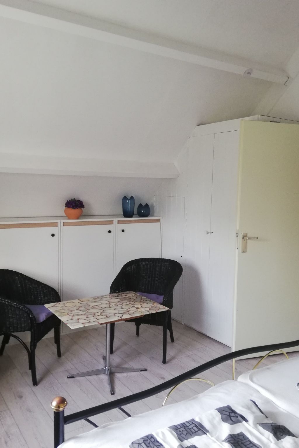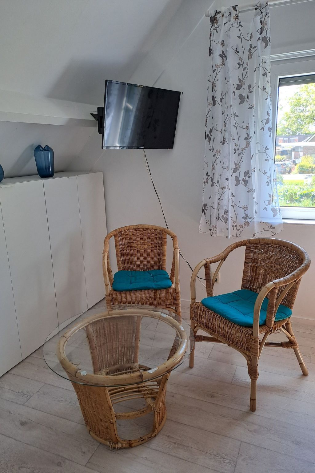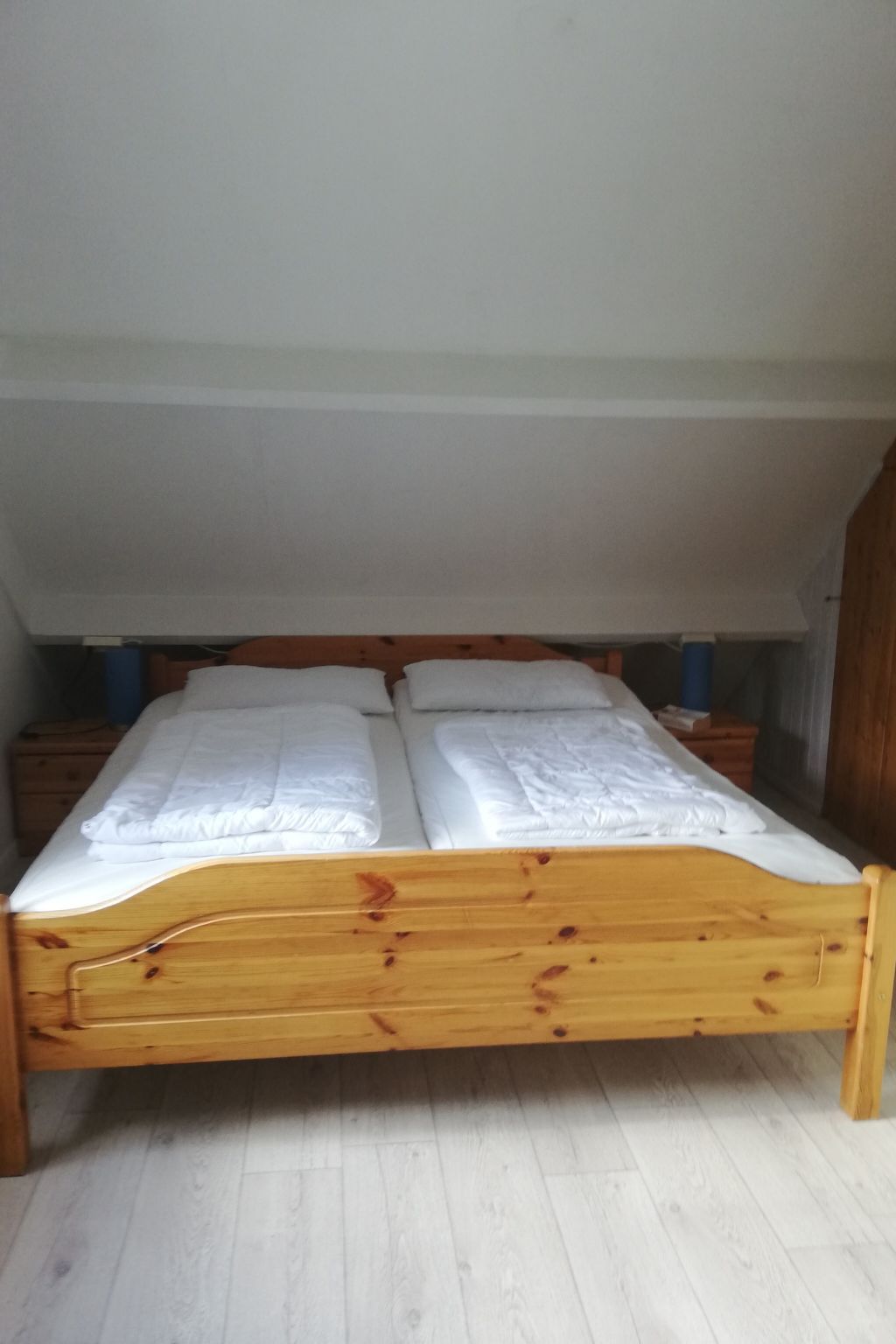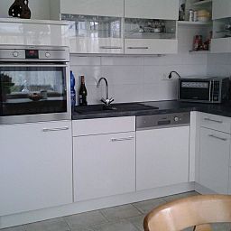 The living space of approx. 90 m² is spread over two fully heated floors. The windows are fitted with electric shutters to darken the room. On the ground floor there is a living area with a seating area and Smart TV (German and English channels only), a dining area, a fully equipped fitted kitchen with fridge-freezer, a double bedroom and a bathroom. The bedroom is equipped with a Smart TV and double bed (2 × 0.90 m wide). The bathroom on the ground floor has a walk-in shower, washbasin and WC. There is also a storage room on this floor with a washing machine and tumble dryer for free use. The upper floor offers two further bedrooms, each with a double bed (2x0.90cm wide) and a satellite TV (German and English channels only), as well as a further bathroom with shower, washbasin and toilet. Fly screens are attached to all bedroom windows. A travel cot is available on site. Internet reception via wifi. Please note that you must bring your own bed linen and towels.