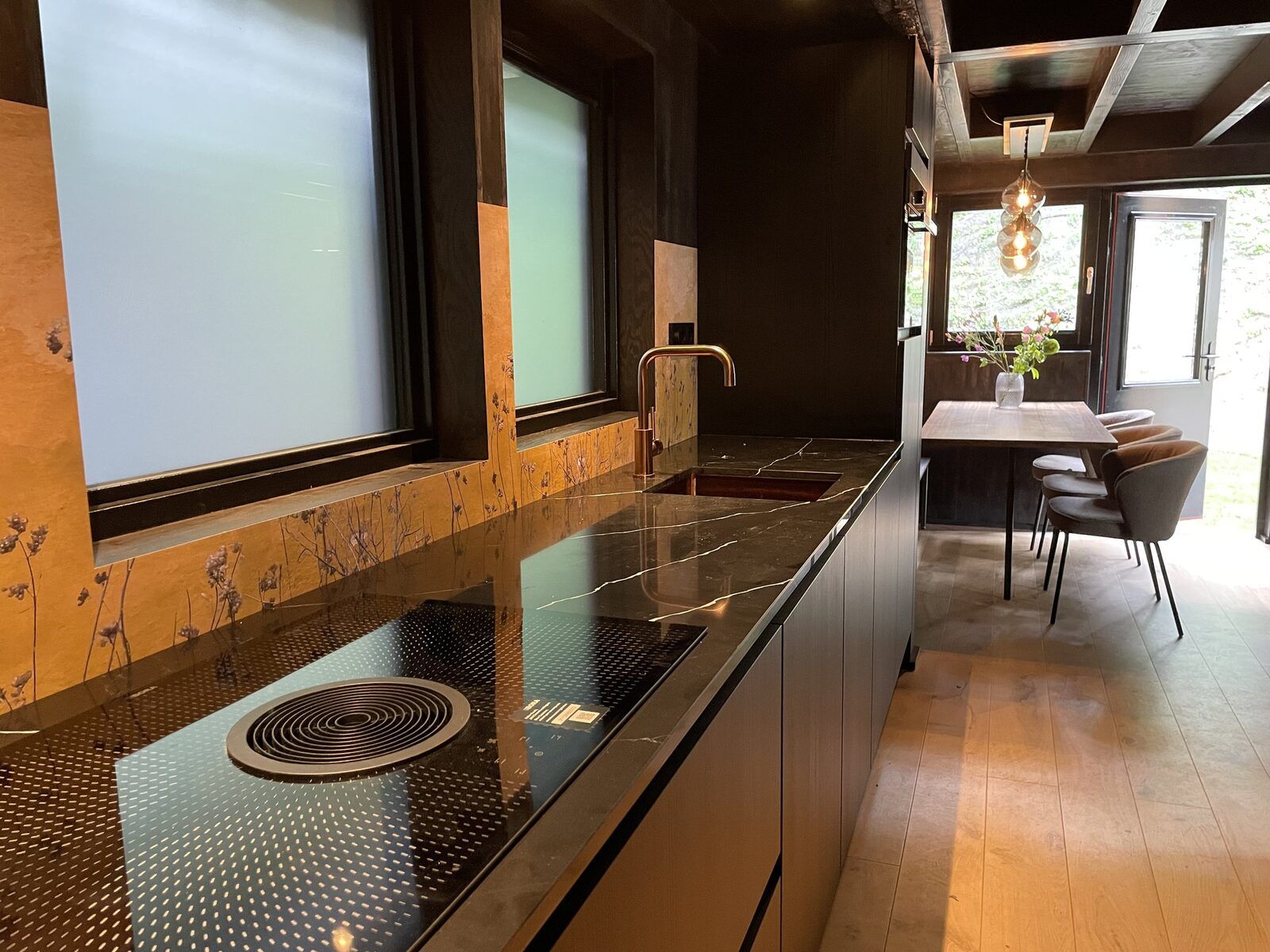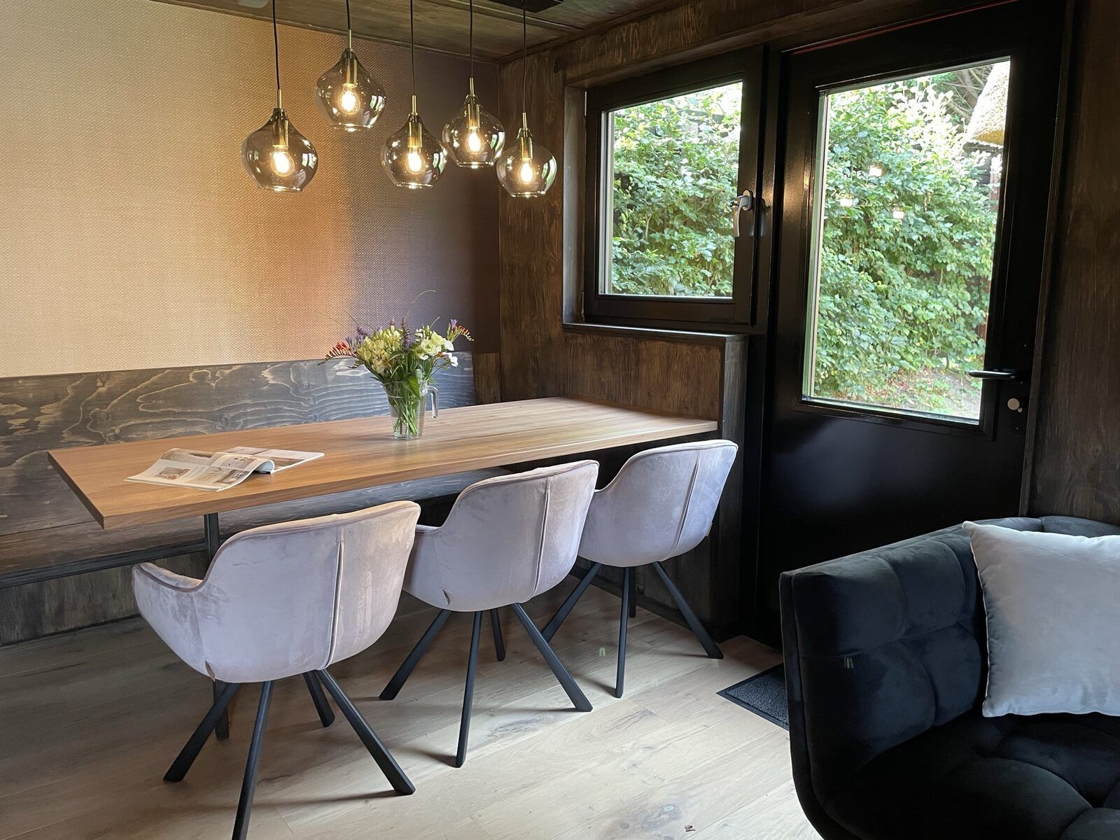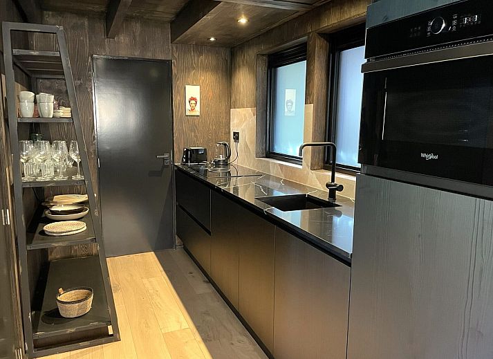 Le salon est chaleureux et décoré avec goût, avec un coin salon confortable, une télévision intelligente et une belle table à manger. La cuisine ouverte est entièrement équipée, notamment d'une plaque à induction, d'un lave-vaisselle, d'un réfrigérateur spacieux et d'une machine à café.