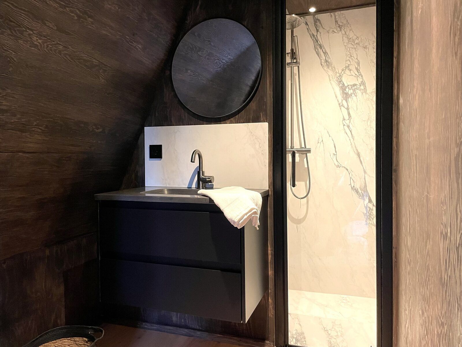 A l'étage supérieur se trouvent les deux autres chambres avec une salle de bain commune. L'une d'entre elles dispose d'un lit double à sommier tapissier, l'autre de deux lits simples à sommier tapissier. La salle de bain est luxueuse et dispose d'une magnifique douche à effet de pluie, d'un lavabo et de toilettes.