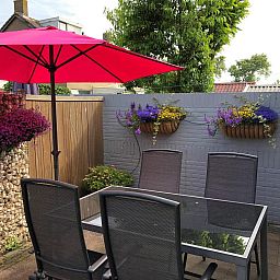 La terrasse entièrement clôturée est équipée d'un joli salon de jardin, où vous pourrez prendre vos repas en toute intimité et profiter du soleil.