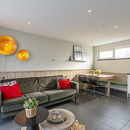 Le salon et la cuisine sont aménagés dans un style moderne et disposent d'une table à manger pour 4 personnes.