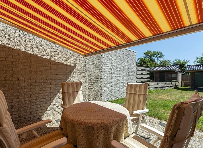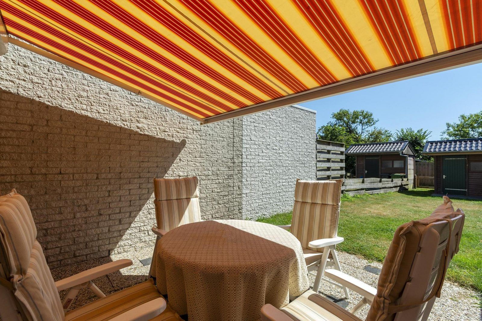 Sur la grande terrasse carrelée, un joli salon de jardin est à votre disposition et vous bénéficiez de l'ombre du store.
