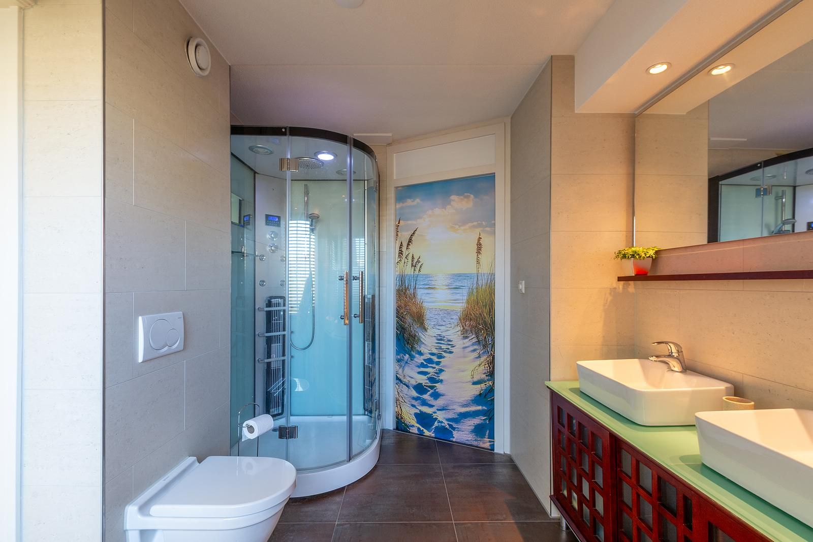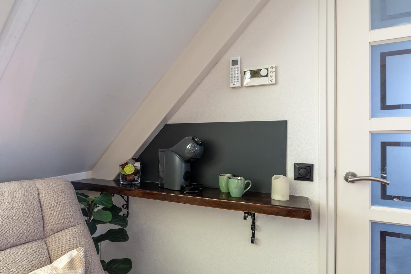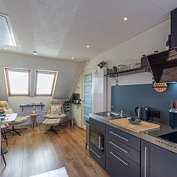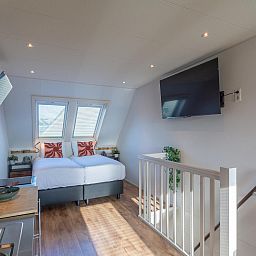 Ce studio spacieux est très lumineux et entièrement équipé. Il dispose d'un confortable lit boxspring pour deux personnes, d'un coin salon agréable et d'un coin cuisine bien équipé. La salle de bains très spacieuse est dotée d'une douche bien-être de luxe, d'un lavabo et de toilettes. Si vous venez avec vos propres vélos, vous pouvez les recharger et les garer sur la terrasse fermée à clé.