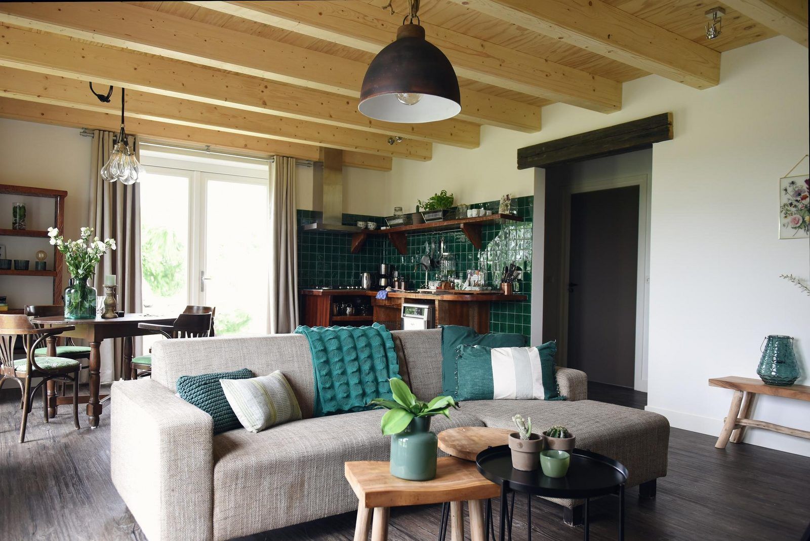 Au rez-de-chaussée se trouve la cuisine ouverte, équipée de tout le confort nécessaire. Le salon dispose d'un canapé et d'une télévision. Il y a une table à manger ronde et chaleureuse avec quatre chaises. Depuis le coin repas, vous avez accès à l'extérieur par des portes-fenêtres.