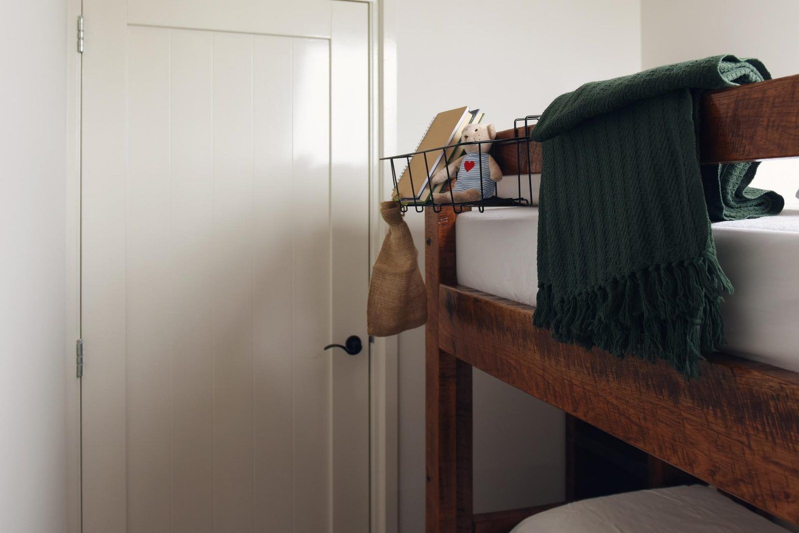 À l'étage se trouvent la salle de bains avec lavabo, toilettes et grande douche, ainsi que les deux chambres : une grande chambre principale avec un lit double et une chambre avec des lits superposés.
