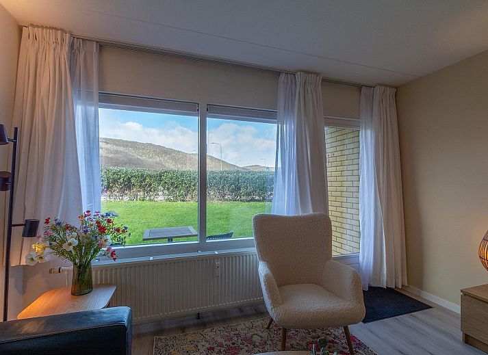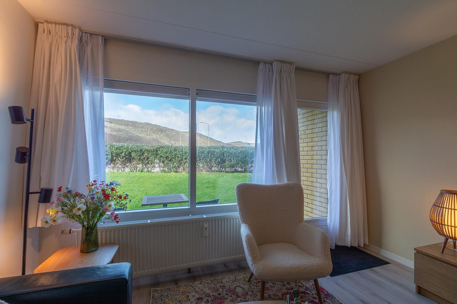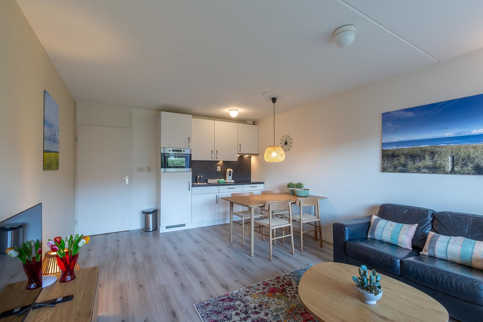 Cet appartement pour 2 personnes est aménagé avec goût et dispose d'un salon lumineux et agréable, d'un coin salon confortable et d'un coin repas agréable près de la cuisine ouverte. Depuis le salon, vous accédez directement à la grande terrasse avec vue sur les dunes. Vous pouvez littéralement entendre la mer.