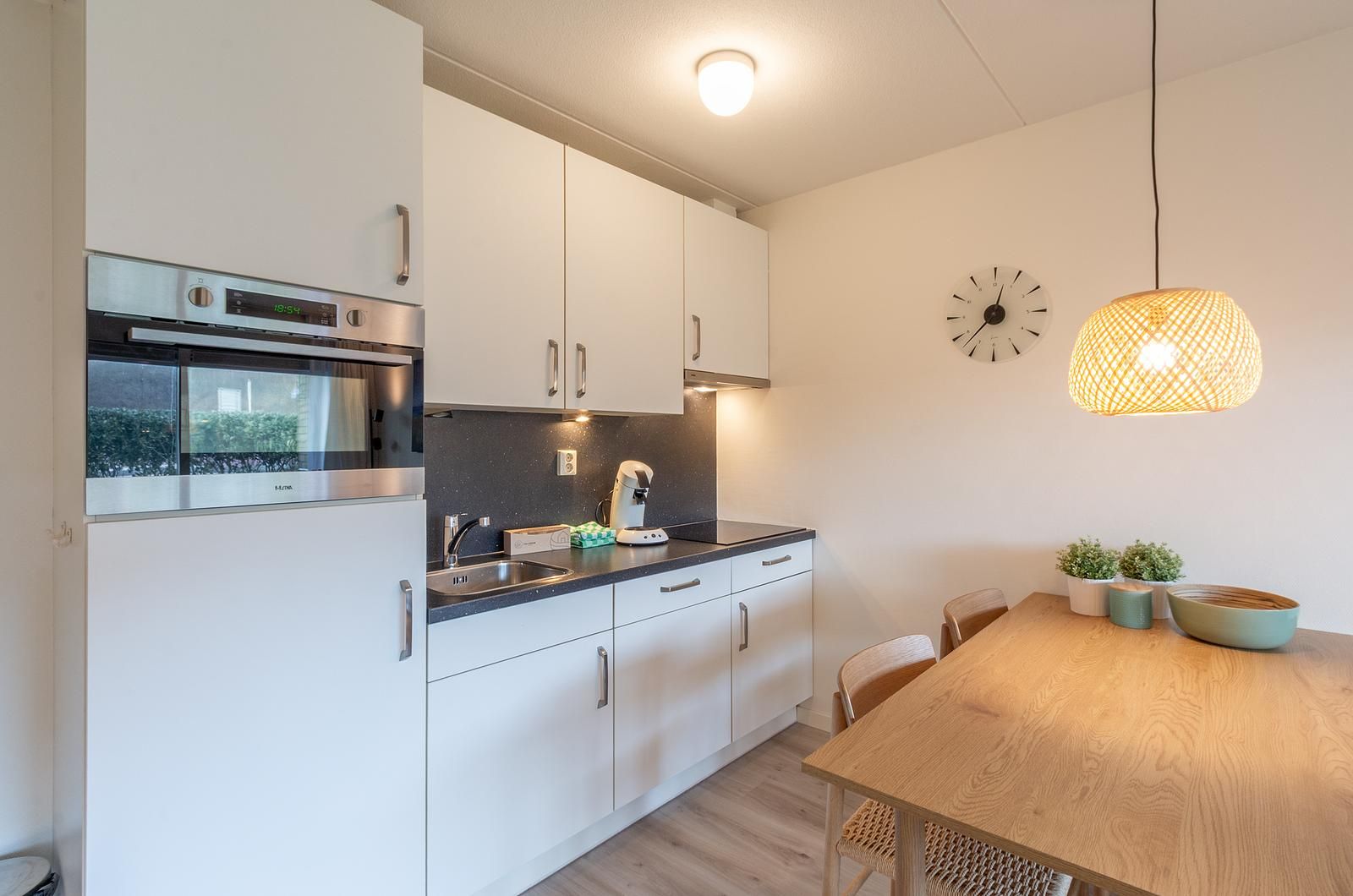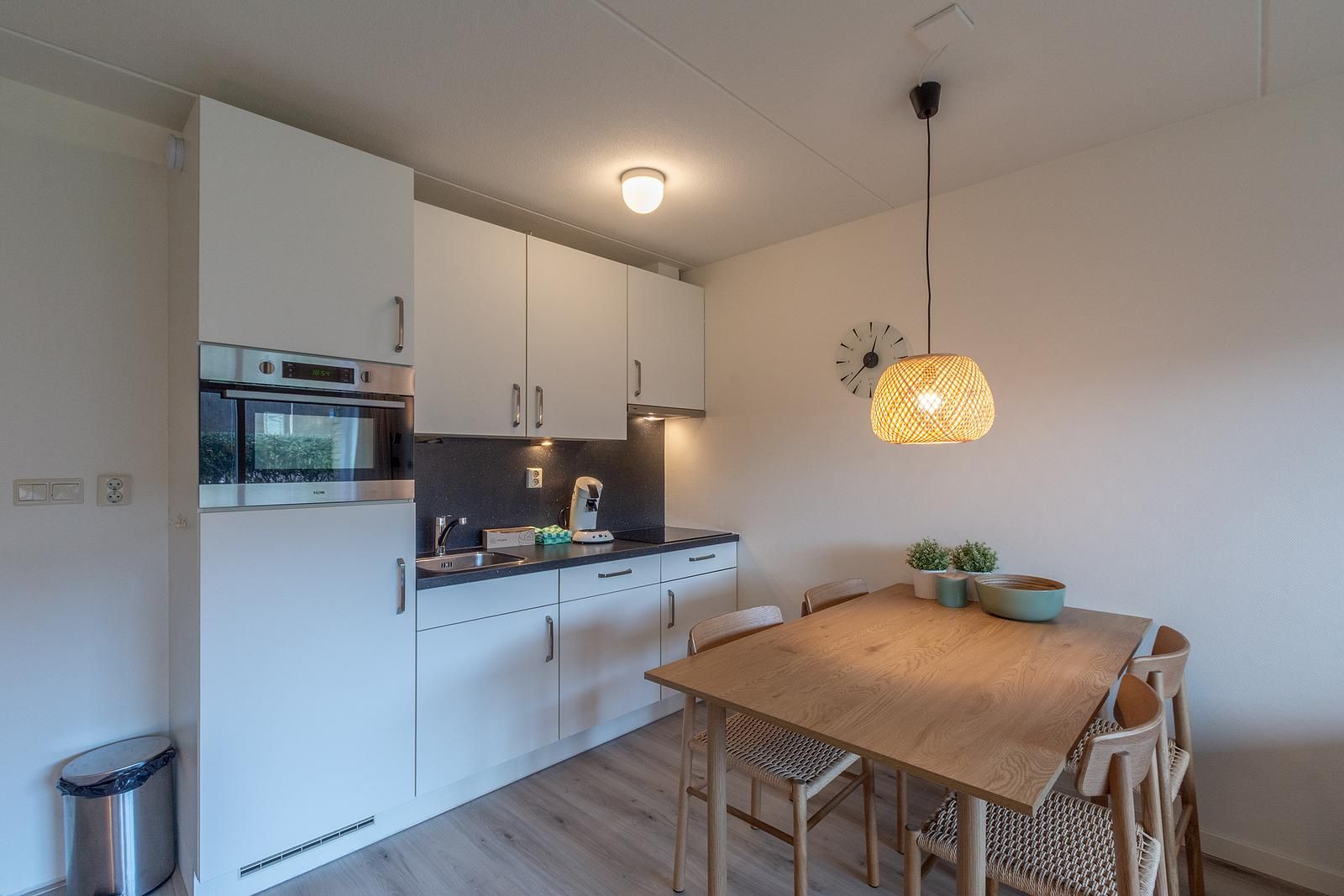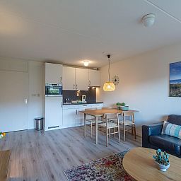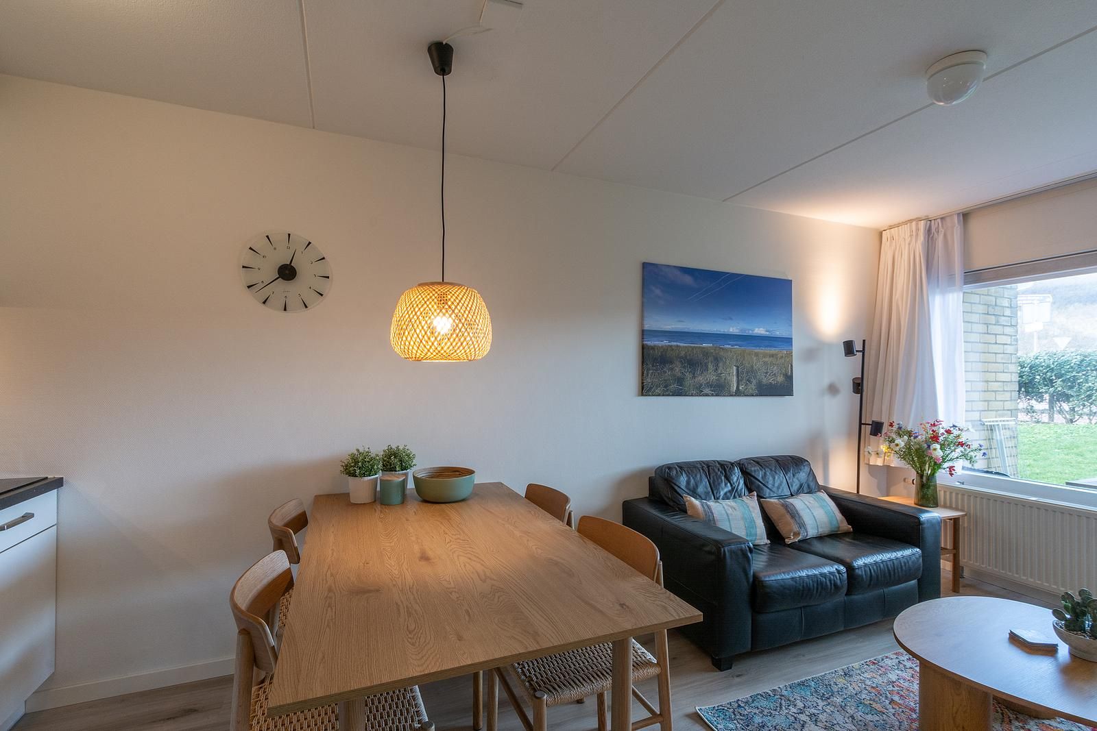 Cet appartement pour 2 personnes est aménagé avec goût et dispose d'un salon lumineux et agréable, d'un coin salon confortable et d'un coin repas agréable près de la cuisine ouverte. Depuis le salon, vous accédez directement à la grande terrasse avec vue sur les dunes. Vous pouvez littéralement entendre la mer.