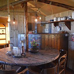 Le Kidz Lodge dispose d'une cuisine conviviale avec un évier (eau potable froide), un réfrigérateur et une cuisinière à gaz pour préparer les repas. Bien sûr, tout l'équipement nécessaire est présent : cafetière (avec filtre), couverts, verres, assiettes, bols, casseroles et spatules.