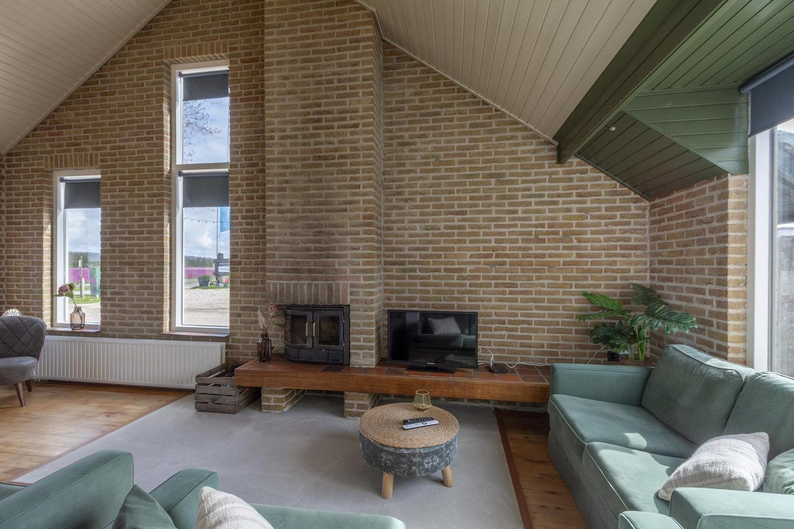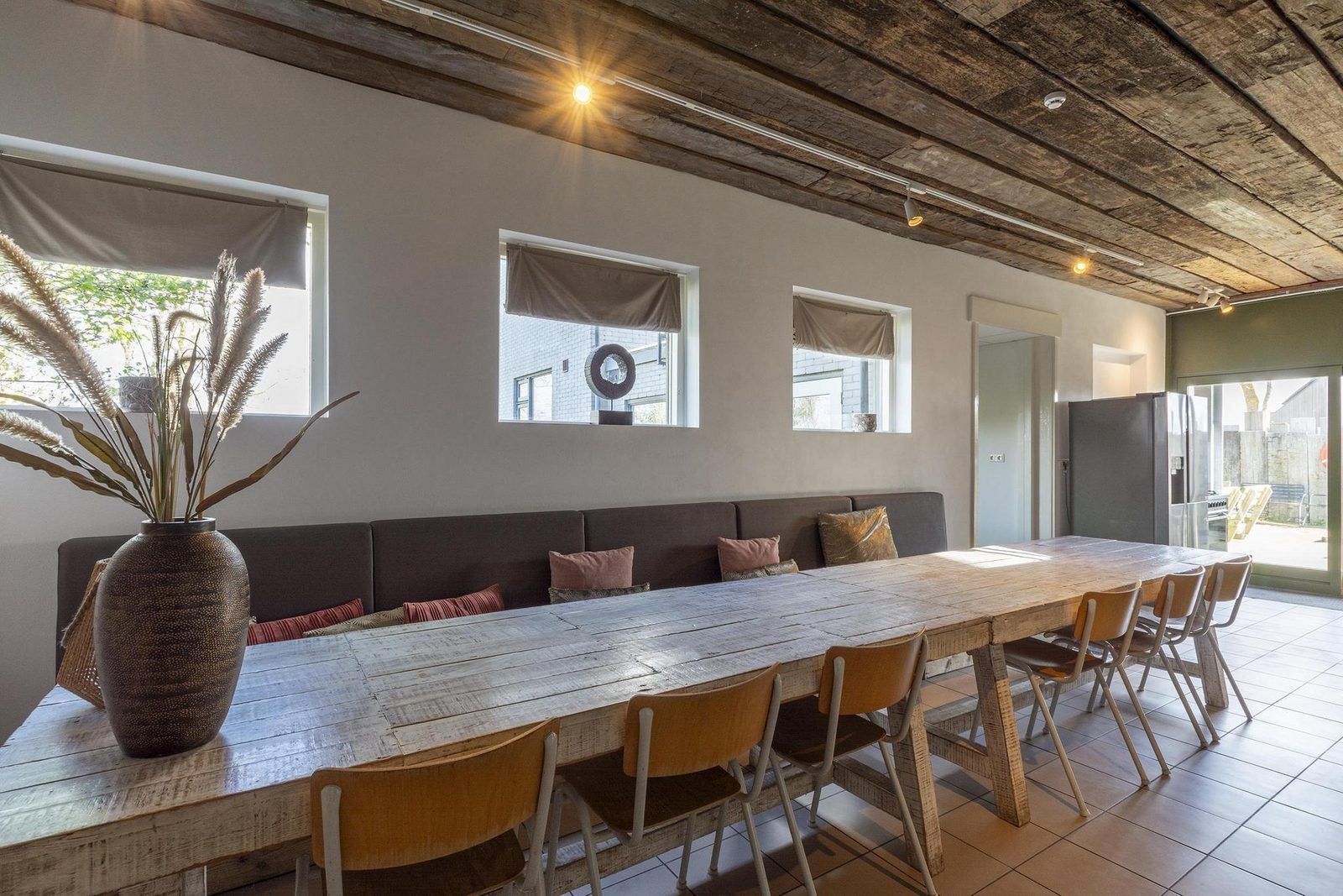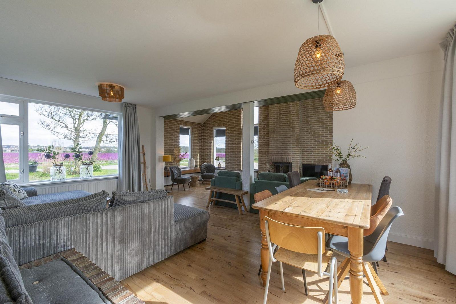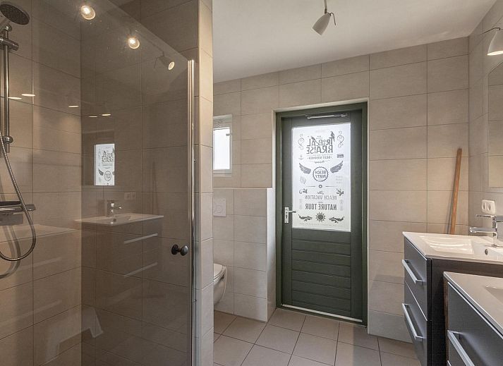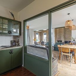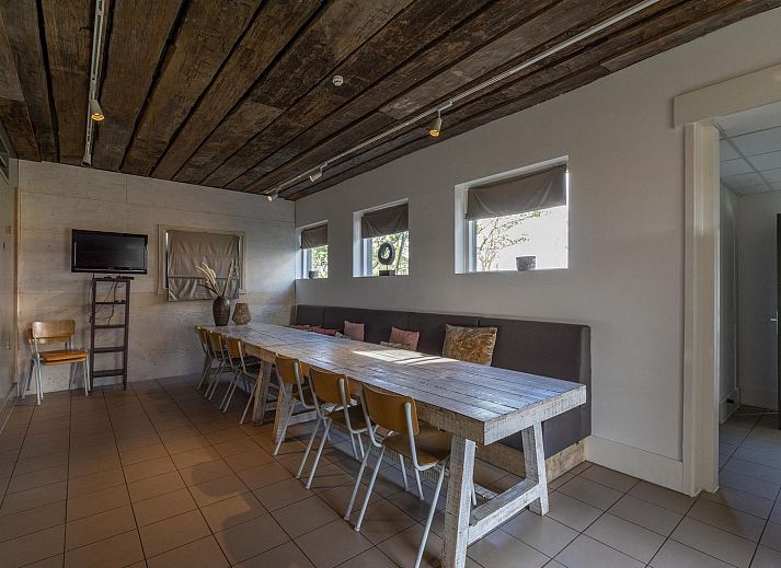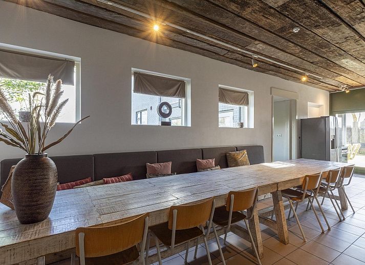 À l'avant de la maison se trouve un salon spacieux avec plusieurs coins salon. L'ambiance y est rustique et chaleureuse. Le salon dispose également d'une cheminée en état de marche. Il y a un coin repas pour 8 personnes, adjacent à la cuisine semi-ouverte. La cuisine est équipée d'un four, d'un lave-vaisselle et d'une cuisinière à 5 feux. Tout le nécessaire en matière de verres, couverts, casseroles et poêles est disponible pour plus de 18 personnes.