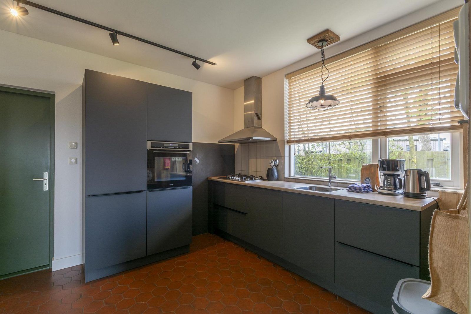 La maison est entourée d'un jardin et d'une terrasse. Des meubles de jardin sont disponibles partout. Depuis la salle commune, vous accédez à la terrasse côté ouest par une grande porte coulissante. Vous y bénéficiez du soleil toute la journée. Cette partie de la terrasse est clôturée et fermée.