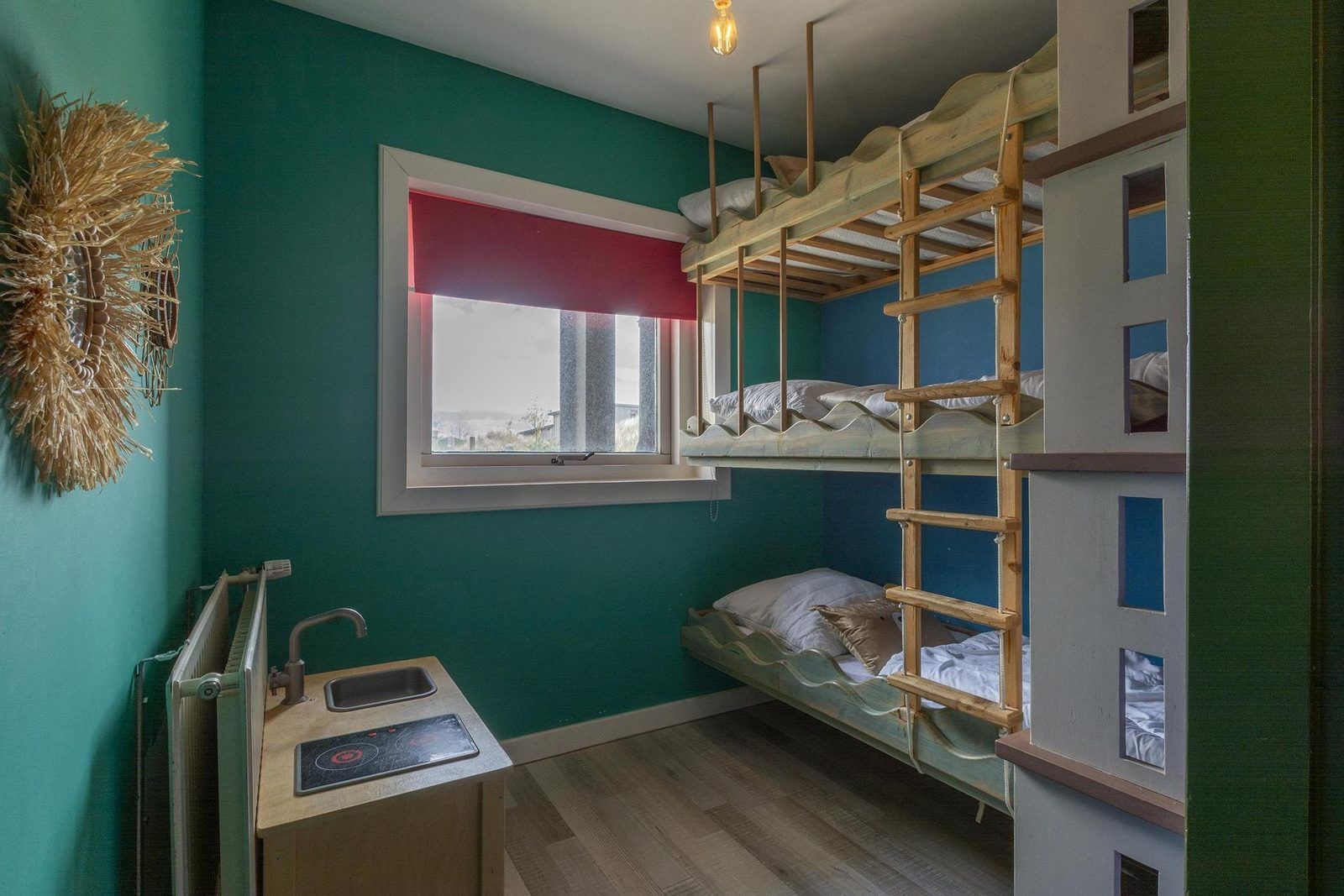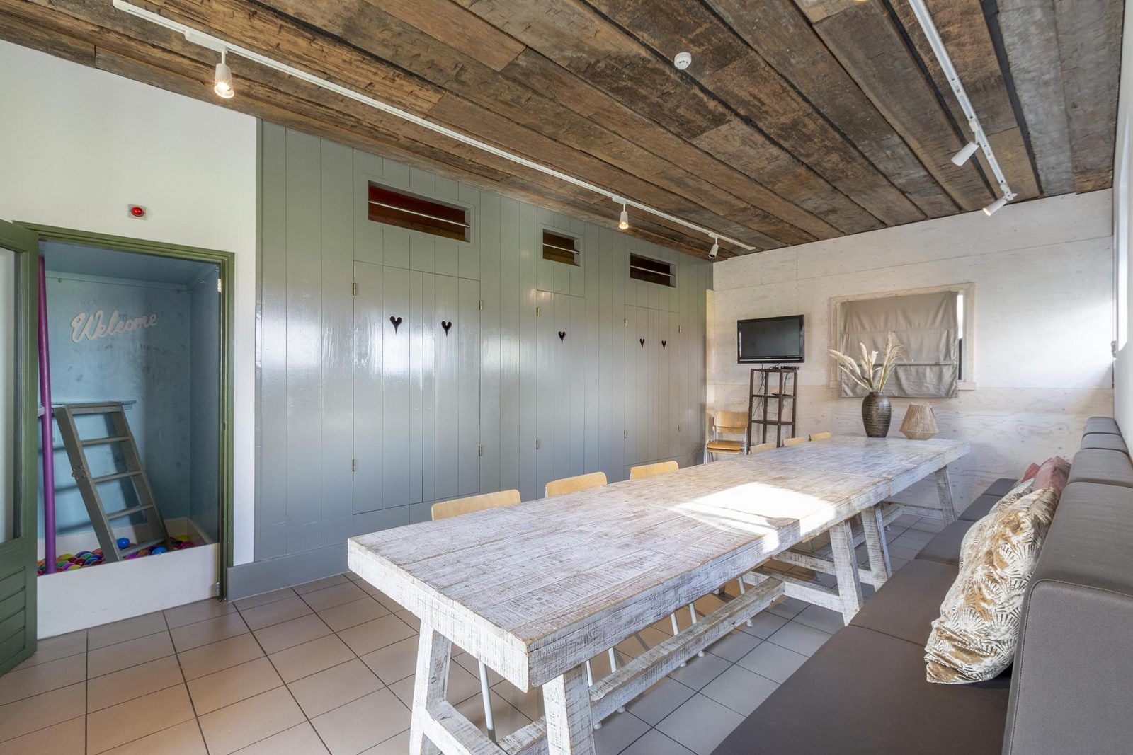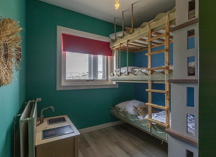 La maison familiale Zuidwester est divisée en une partie avant et une partie arrière. À l'arrière se trouve une grande salle commune où vous pourrez tous profiter d'un délicieux dîner, jouer à des jeux en bonne compagnie ou vous détendre devant la télévision. Cette pièce est équipée de deux lits encastrés, chacun pouvant accueillir deux personnes. Les enfants peuvent jouer à leur guise dans la piscine à balles, surmontée d'un espace de jeux. Juste à côté se trouve la chambre des enfants avec trois lits.