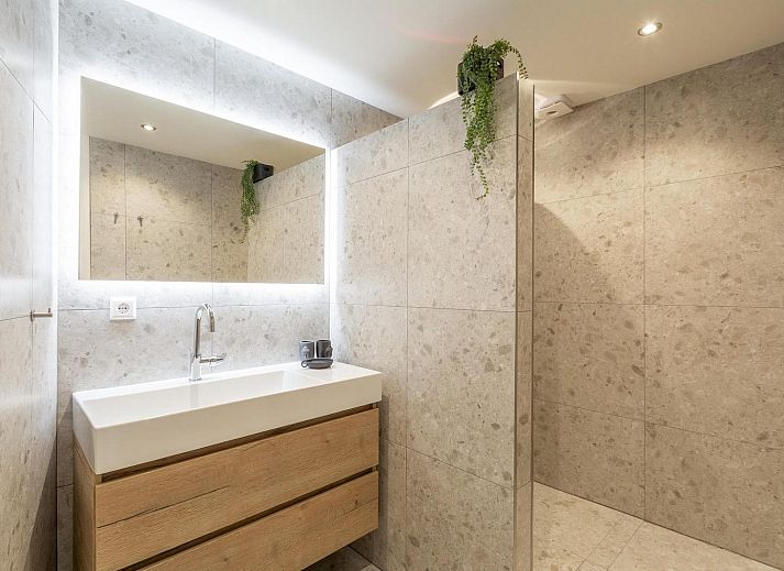 La salle de bains, par exemple, présente un aspect pierre naturelle et est équipée d'une délicieuse douche à effet pluie. Le salon vous donne vraiment l'impression d'être tout près de la plage et de la mer, avec un magnifique papier peint photo et un éclairage agréable. Vous y trouverez une grande smart TV et une enceinte pour profiter ensemble de votre musique préférée. La baie vitrée coulissante donne accès à la grande terrasse dotée d'un agréable coin salon. C'est là que vous profiterez des premiers rayons de soleil le matin. Quel plaisir de prendre le petit-déjeuner ici à deux et de profiter de la vue phénoménale. Bien sûr, la chambre dispose d'un lit double (160 x 200), garant d'un excellent confort de sommeil.