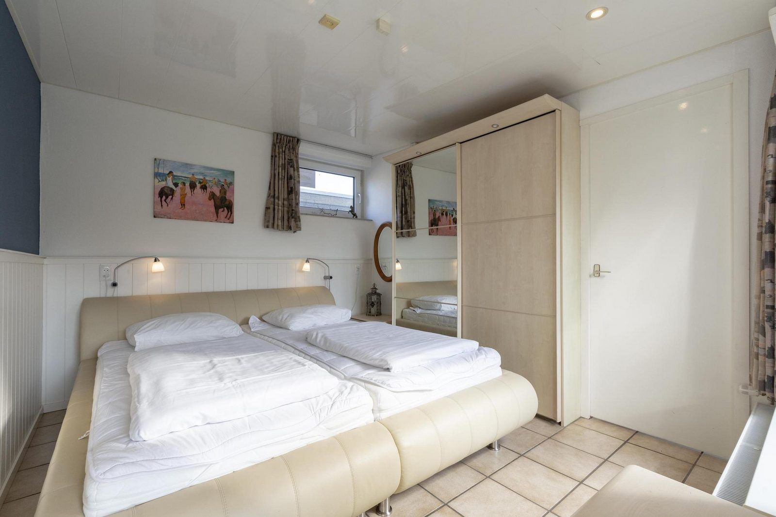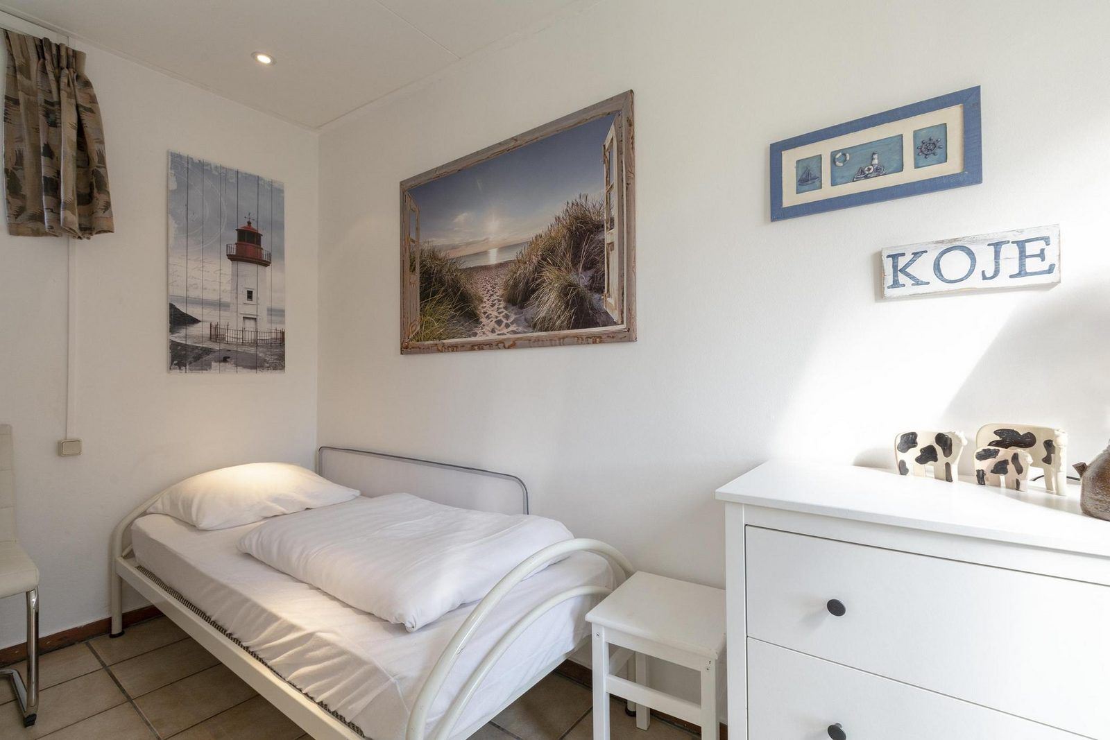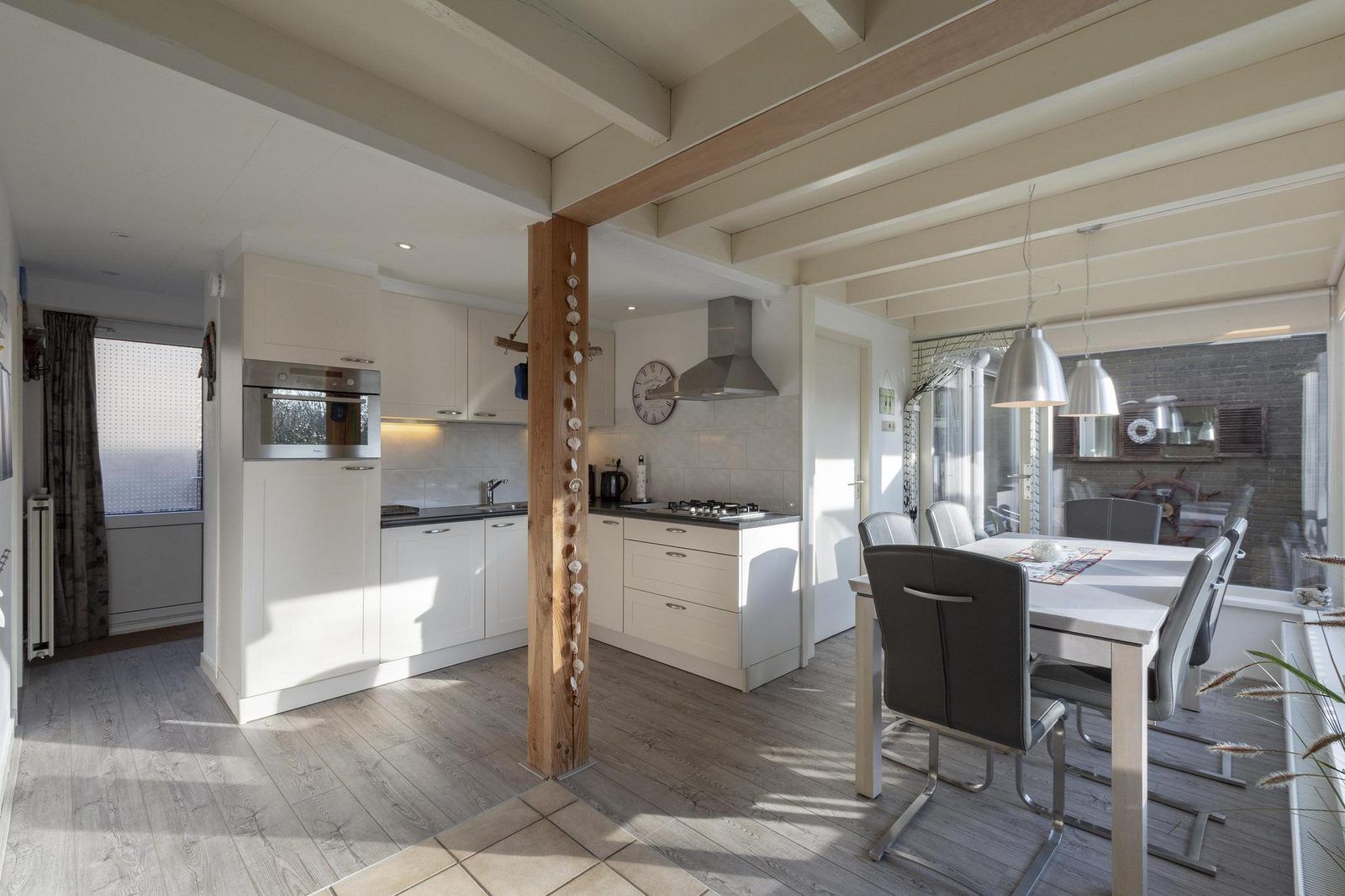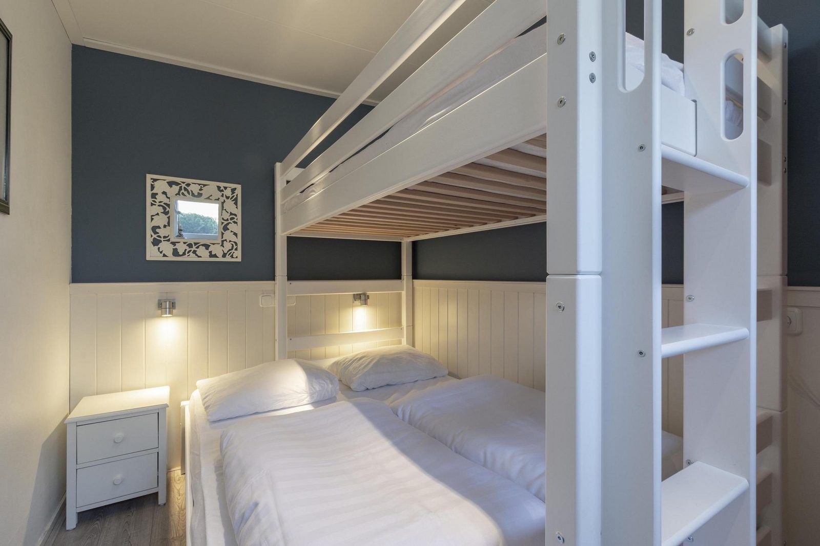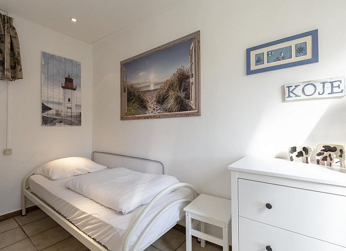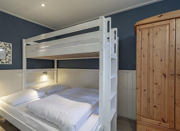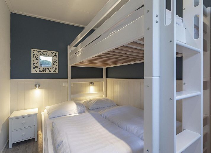 Grâce à l'extension, la cuisine ouverte et le salon sont lumineux et spacieux. Le bungalow dispose de 3 chambres, dont une chambre spacieuse avec un lit double. Depuis cette chambre, une porte communicante donne accès à une chambre avec un lit simple. La troisième chambre est équipée d'un lit superposé pour trois personnes.
