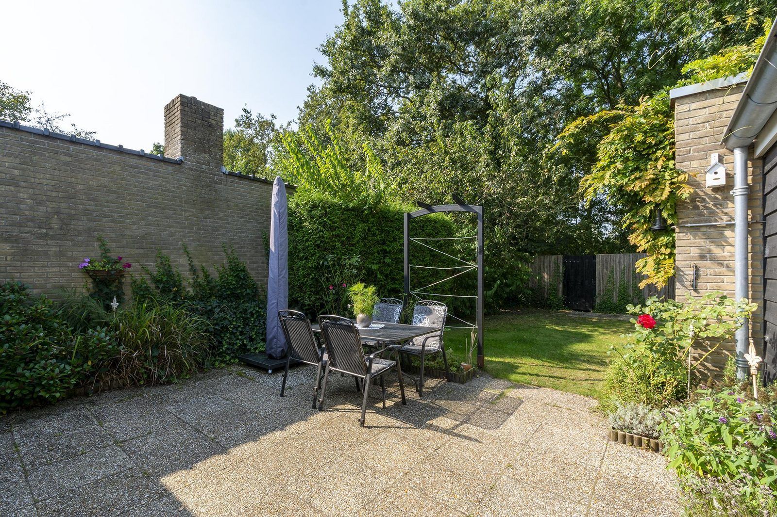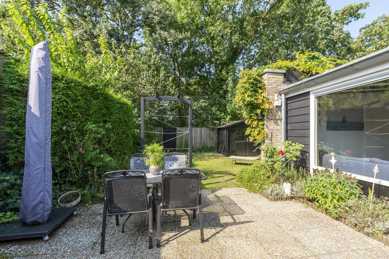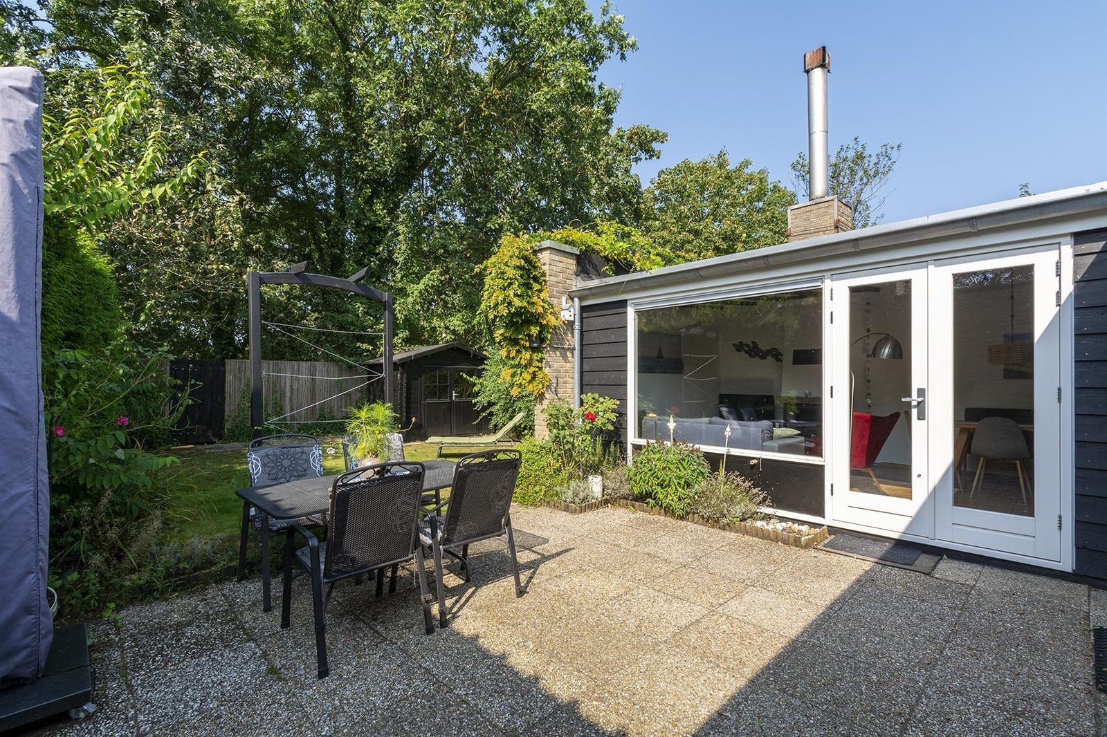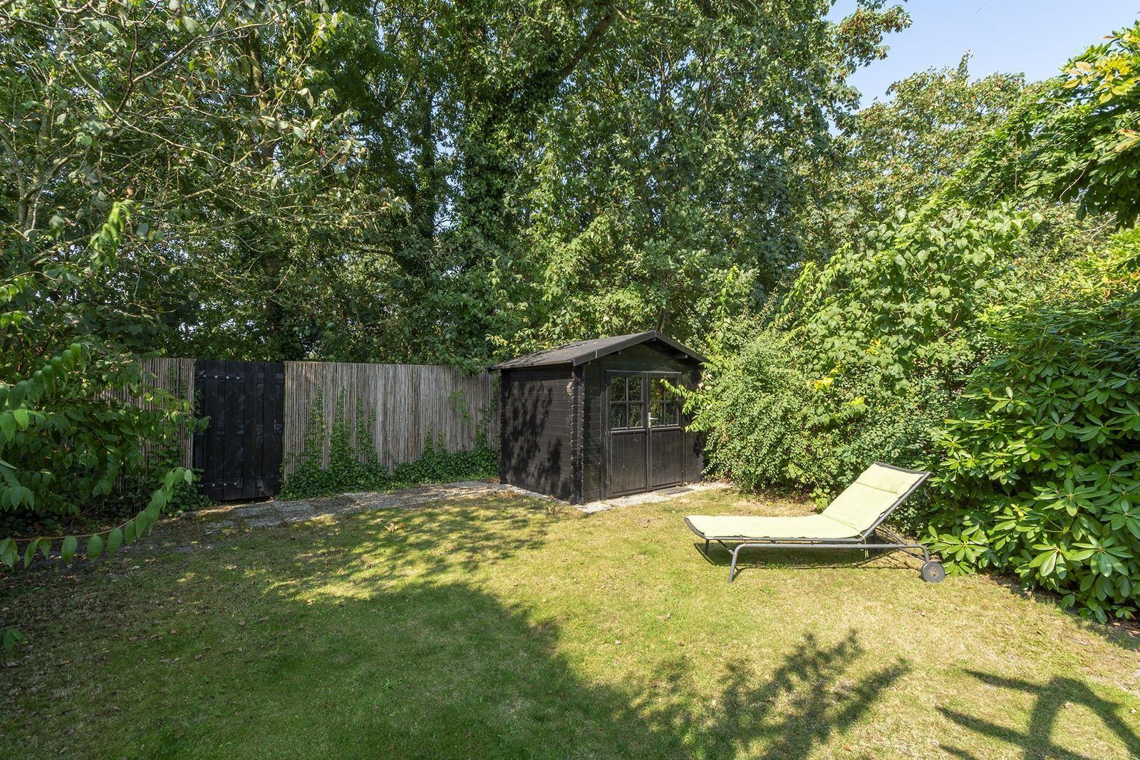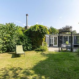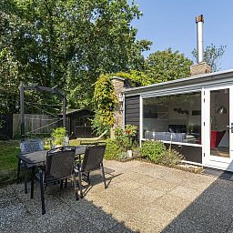 Depuis le salon, des portes-fenêtres s'ouvrent directement sur la terrasse, qui donne sur le jardin entièrement clôturé. La grande terrasse ensoleillée vous offre beaucoup d'intimité, un endroit idéal pour profiter du soleil et prendre vos repas ensemble. Le jardin est également accessible par l'arrière, ce qui est pratique si vous avez par exemple des vélos avec vous. Vous pouvez les garer dans le jardin ou dans l'abri de jardin.