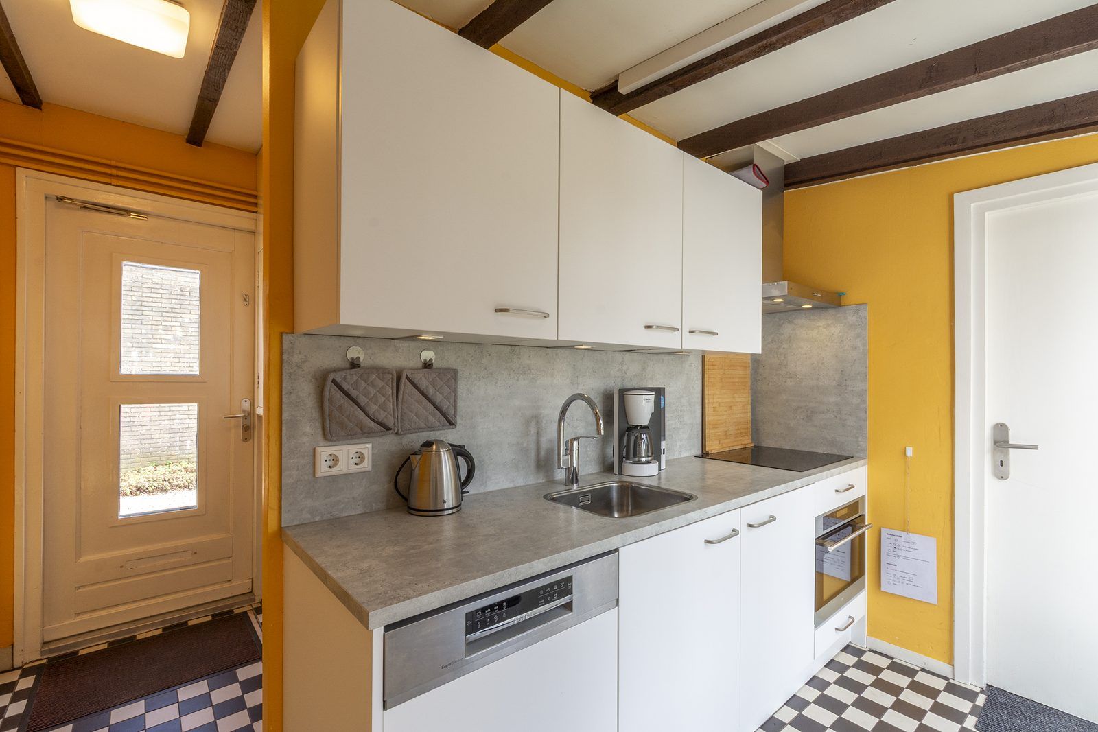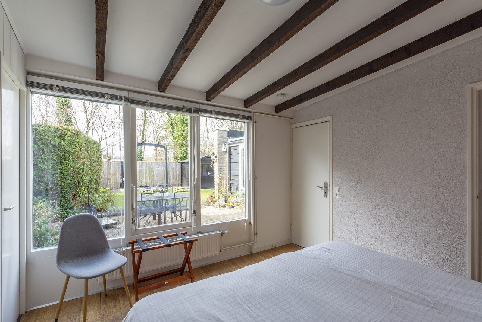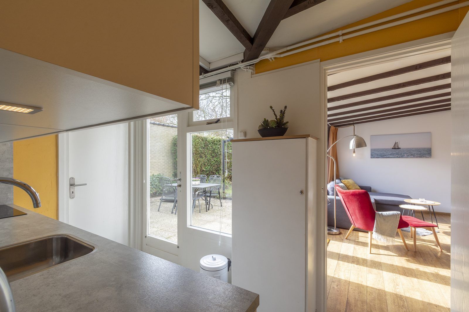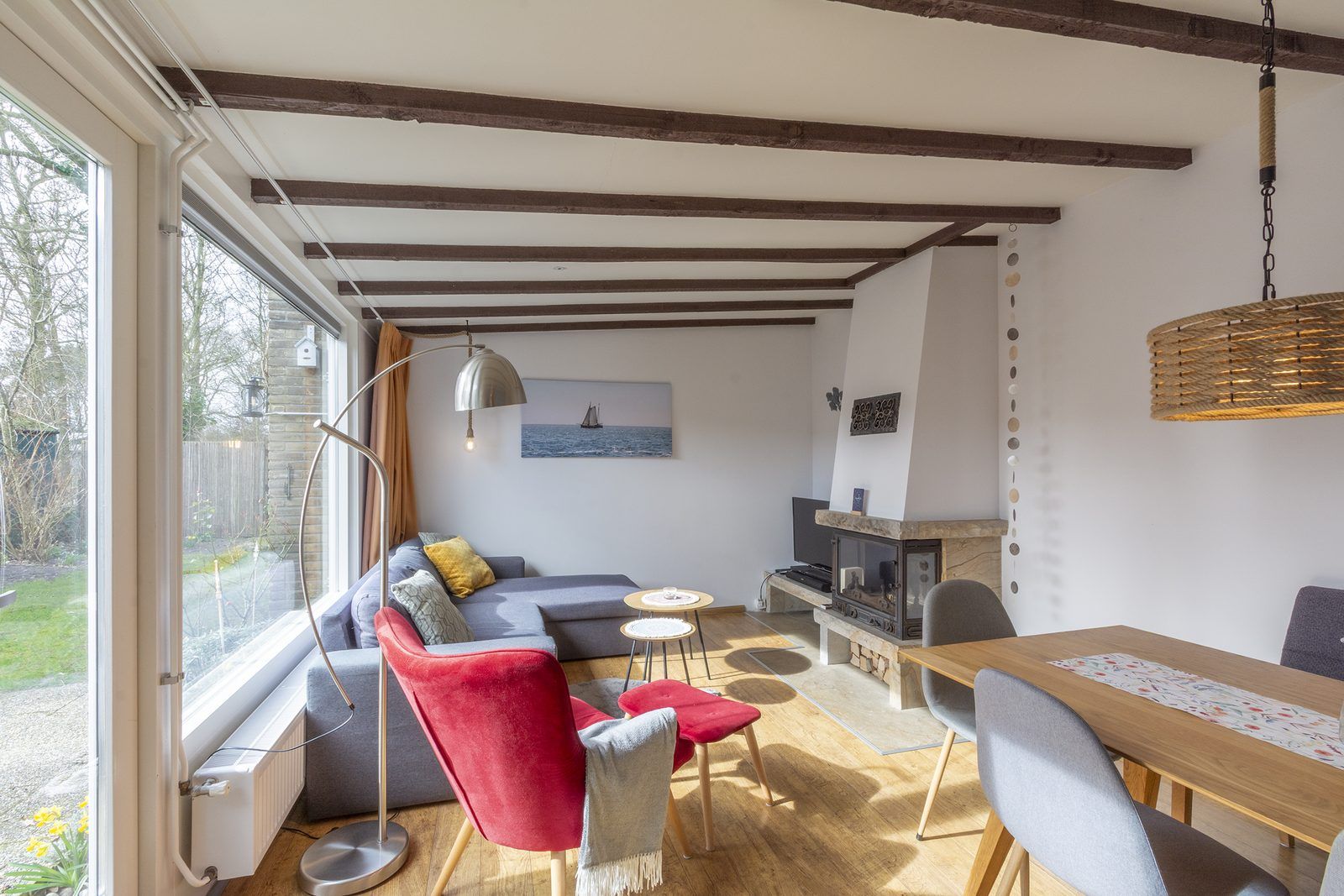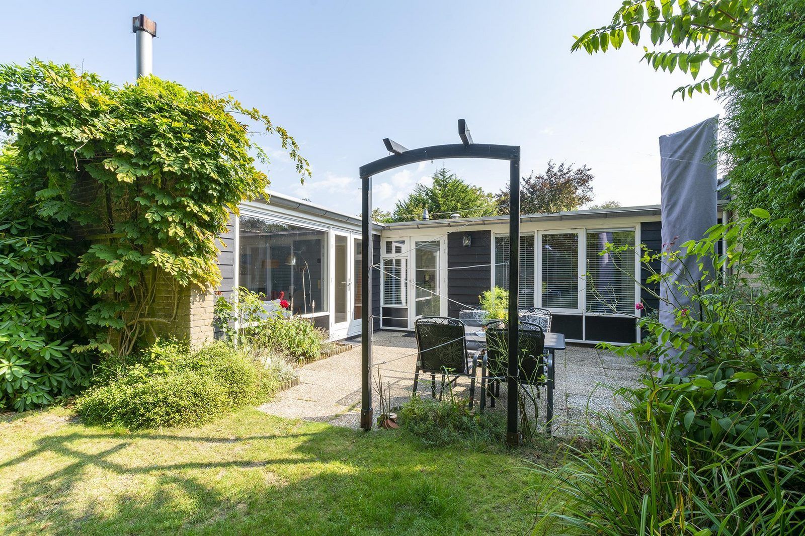 Depuis le salon, des portes-fenêtres s'ouvrent directement sur la terrasse, qui donne sur le jardin entièrement clôturé. La grande terrasse ensoleillée vous offre beaucoup d'intimité, un endroit idéal pour profiter du soleil et prendre vos repas ensemble. Le jardin est également accessible par l'arrière, ce qui est pratique si vous avez par exemple des vélos avec vous. Vous pouvez les garer dans le jardin ou dans l'abri de jardin.