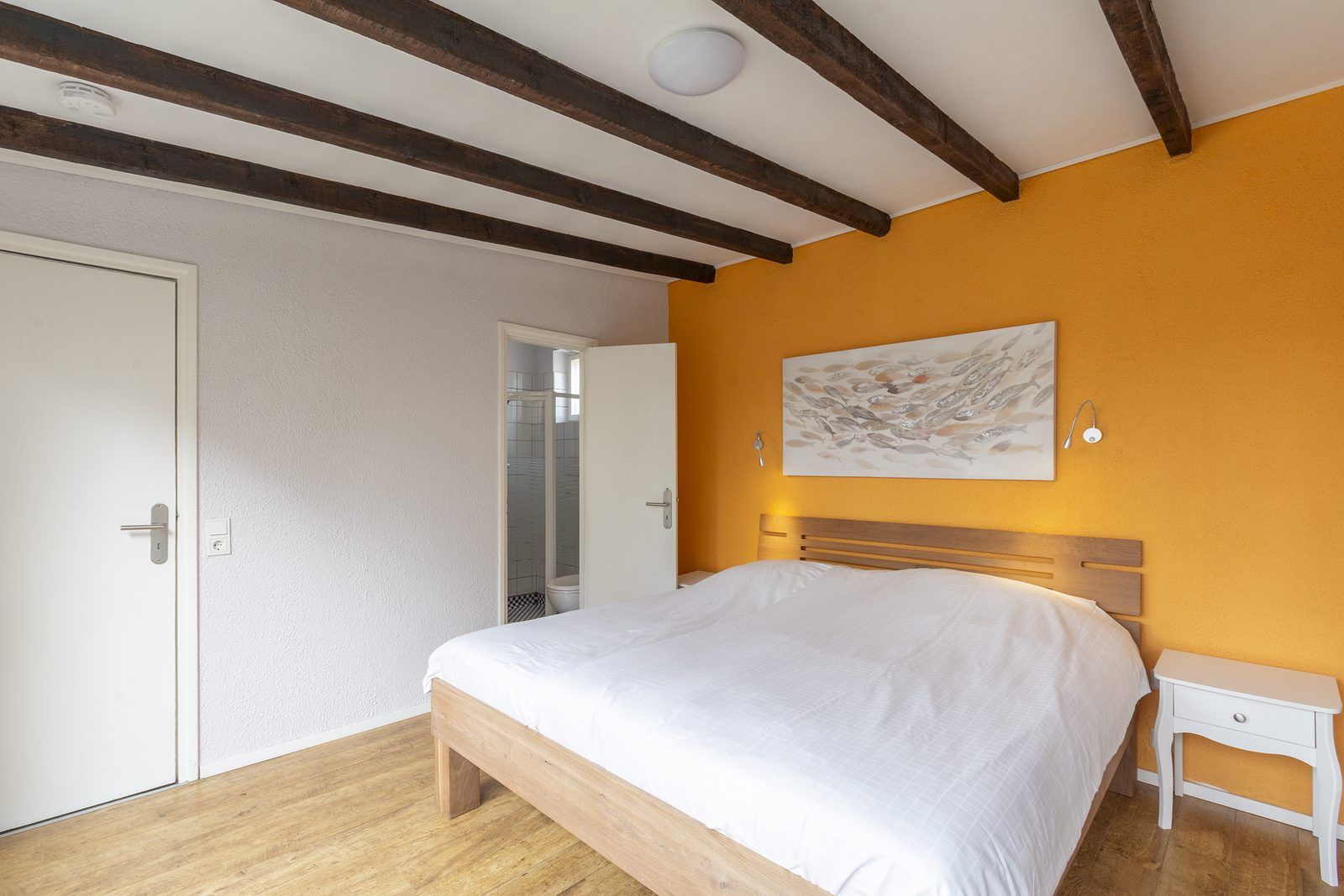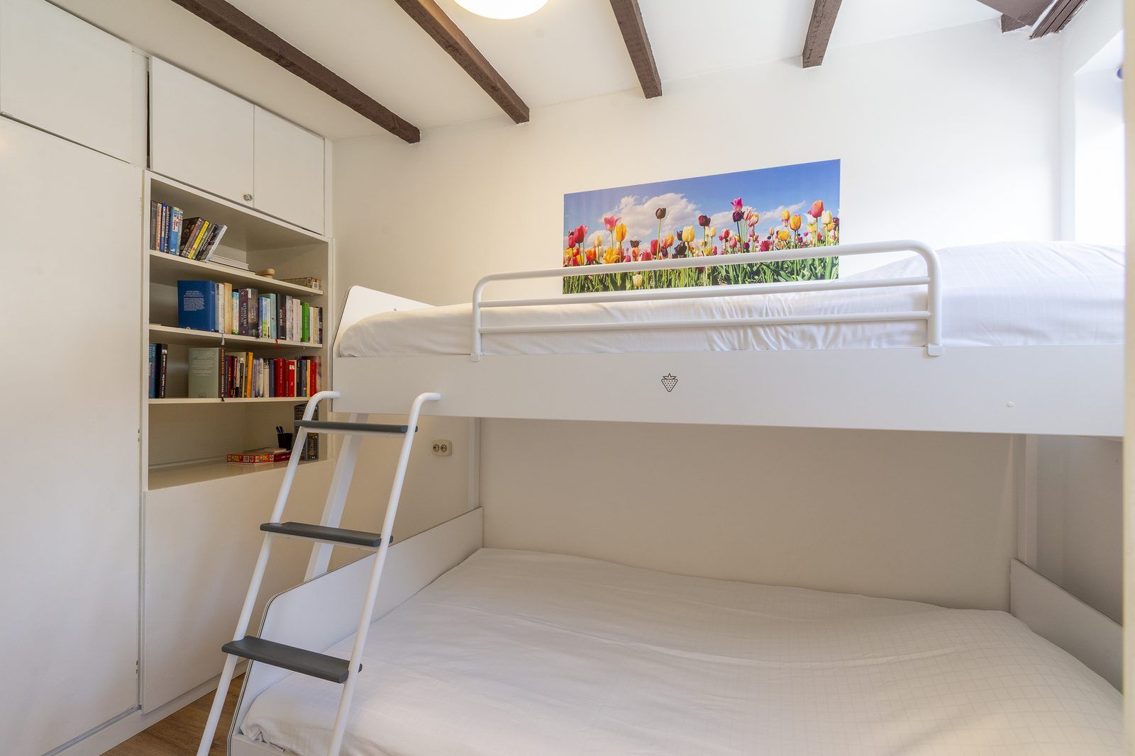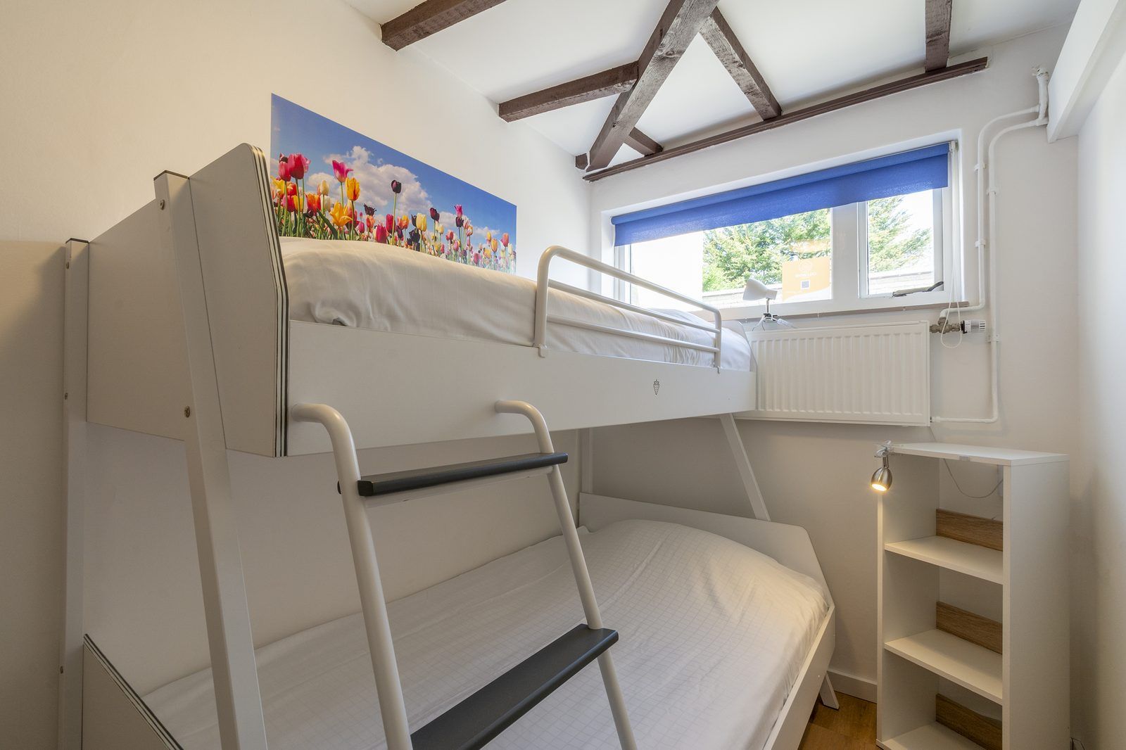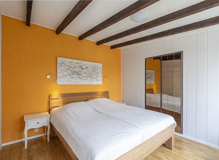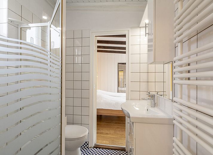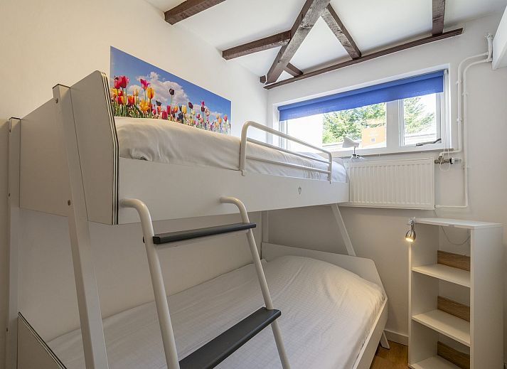 Il y a deux chambres, dont une grande chambre avec un lit double. Depuis cette chambre, vous avez un accès direct à la salle de bains. La salle de bains est équipée d'une cabine de douche, d'un lavabo et de toilettes. La deuxième chambre est équipée de lits superposés.