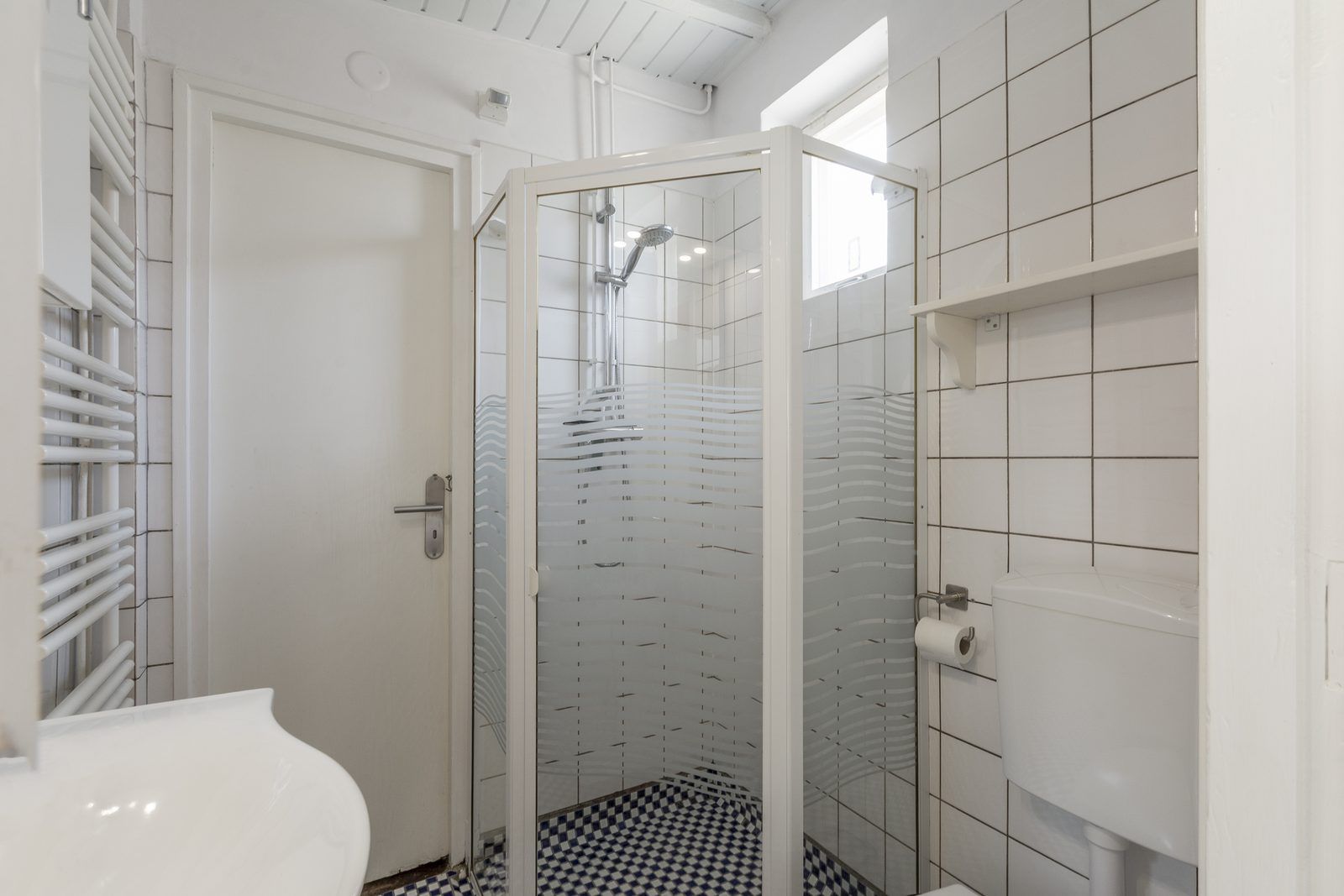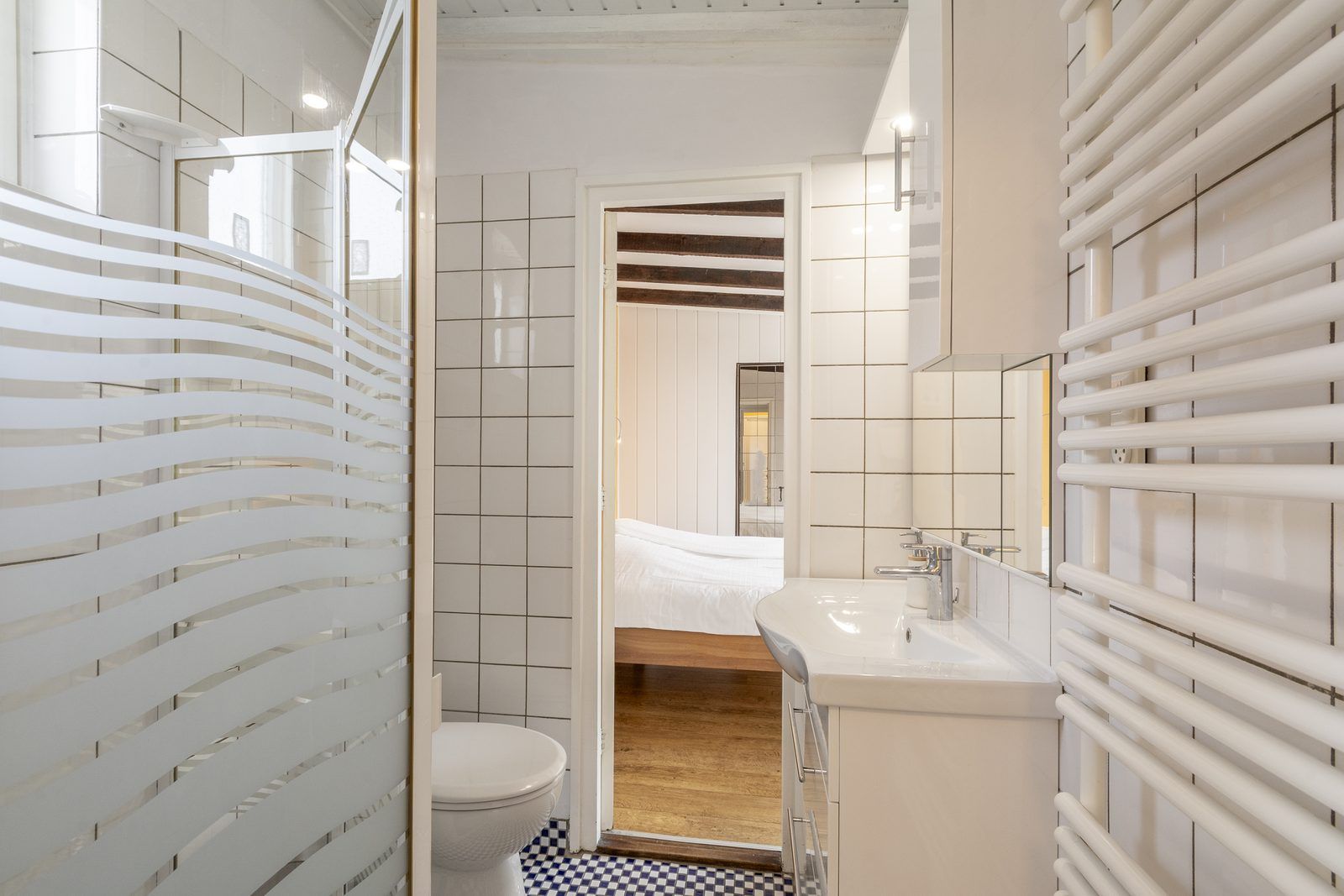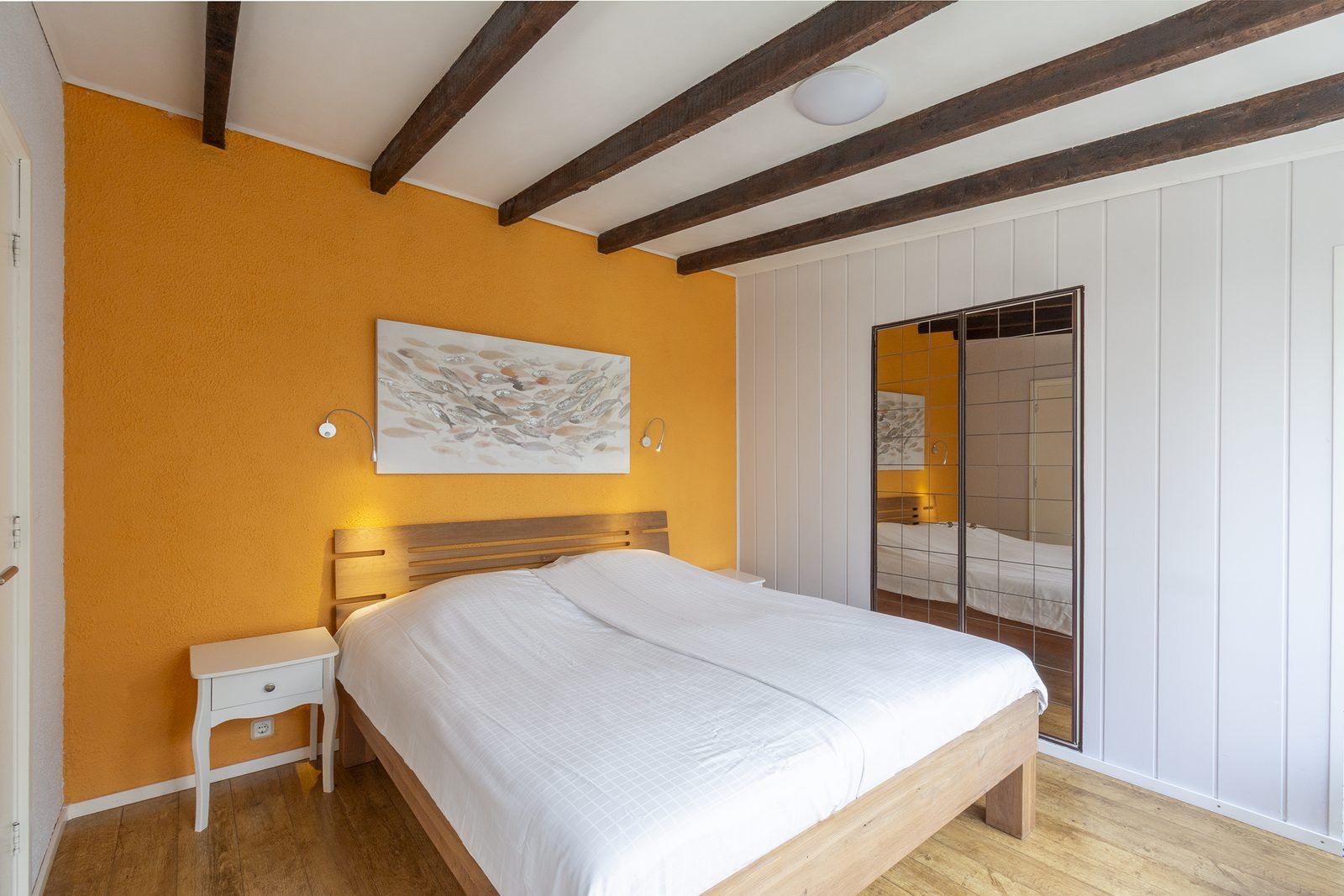 Il y a deux chambres, dont une grande chambre avec un lit double. Depuis cette chambre, vous avez un accès direct à la salle de bains. La salle de bains est équipée d'une cabine de douche, d'un lavabo et de toilettes. La deuxième chambre est équipée de lits superposés.