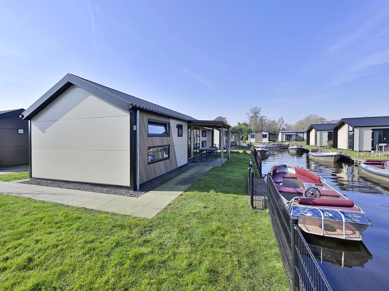 Vakantiepark Giethoorn bestaat uit drie schiereilanden, gesitueerd aan de oever van de Bovenwijde. Met de karakteristieke boogbruggen en grachten, vormt het park een klein waterdorp op zich. De kleuren van de lodges verschillen onderling, hetgeen een afwisselend beeld geeft. Een prachtige plek in het Venetië van het Noorden.