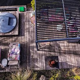 Notre maison de vacances bohème avec sauna est entièrement autonome et équipée du WiFi, de l'électricité, de l'eau (chaude), d'une douche intérieure et extérieure, d'une cuisine extérieure et d'un agréable poêle à bois. Pour les plus aventureux, il y a des balançoires, un toboggan, des chaises suspendues et un hamac sur la véranda.