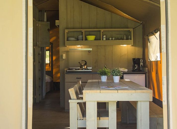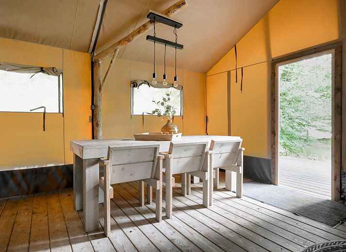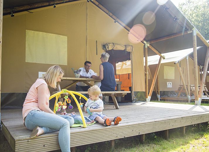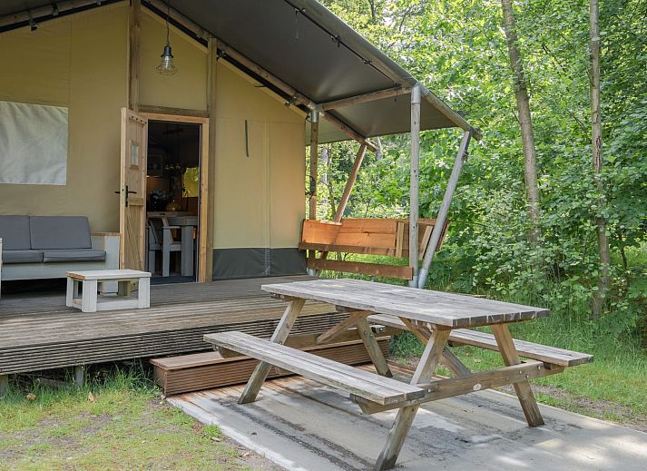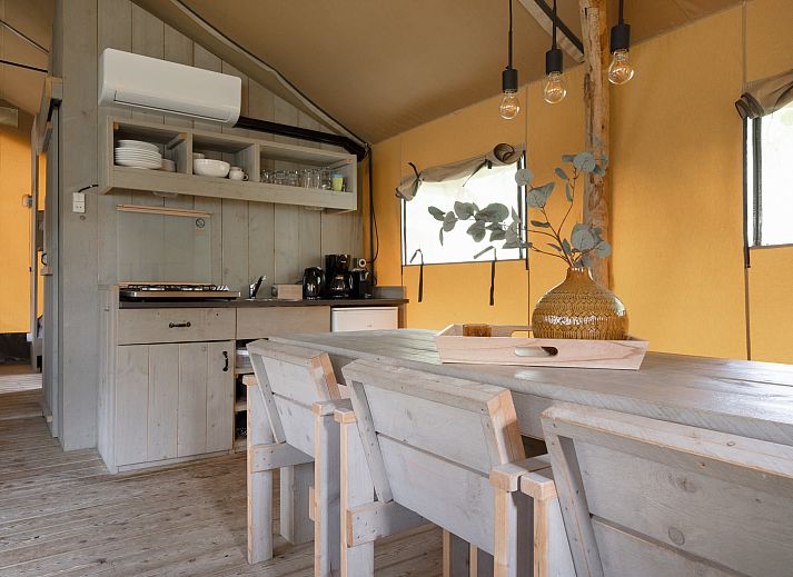 Tente safari atmosphérique pour 6 personnes, entièrement équipée, dont cinq se trouvent ensemble sur un terrain privé. Les murs et les meubles sont en bois d'échafaudage robuste. Dans ces tentes de luxe, vous ferez l'expérience d'une véritable sensation de camping et vous trouverez, entre autres, les éléments suivants