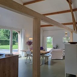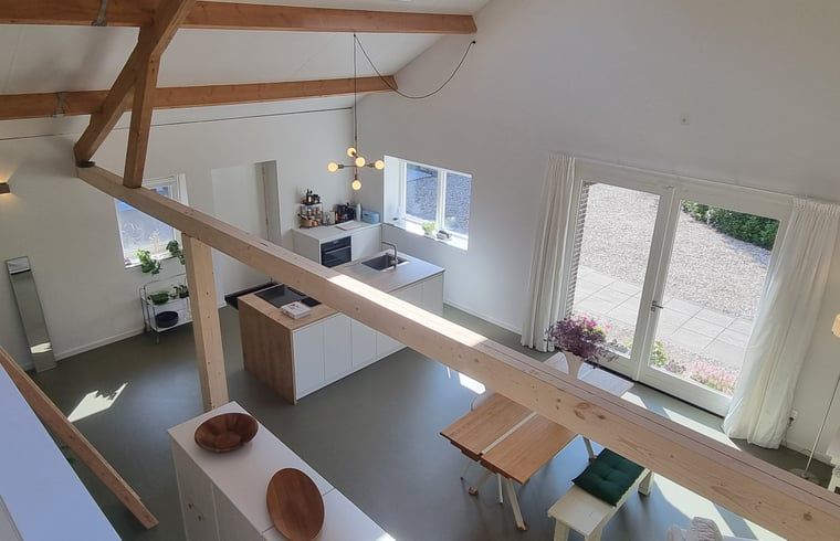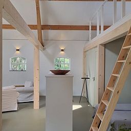 Une annexe de notre ferme près d'Amersfoort a été transformée en une maison nature de 98 m². L'ambiance est celle d'un loft, mais en pleine nature. L'objectif est d'offrir un lieu de repos et de retraite. Avec sa charpente pleine de caractère, ses matériaux naturels, ses couleurs apaisantes et sa belle lumière naturelle, c'est un espace très agréable. Et il y a même de la place pour faire du yoga.