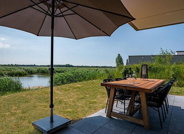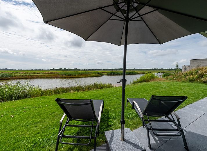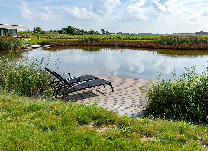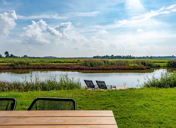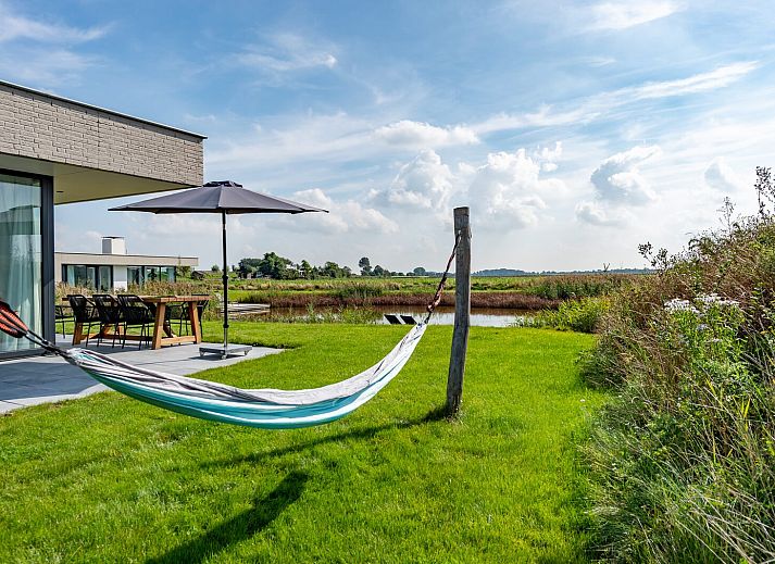 Si vous ouvrez les portes du jardin dans le salon pour accéder à la terrasse spacieuse et merveilleusement ensoleillée, vous pourrez immédiatement profiter de l'extérieur. Vous y trouverez une grande table à manger et deux chaises longues confortables. Le jardin spacieux est bordé d'un étang et d'un patio. Ici, vous pouvez profiter du soleil sur l'eau ou admirer le magnifique coucher de soleil dans la soirée.