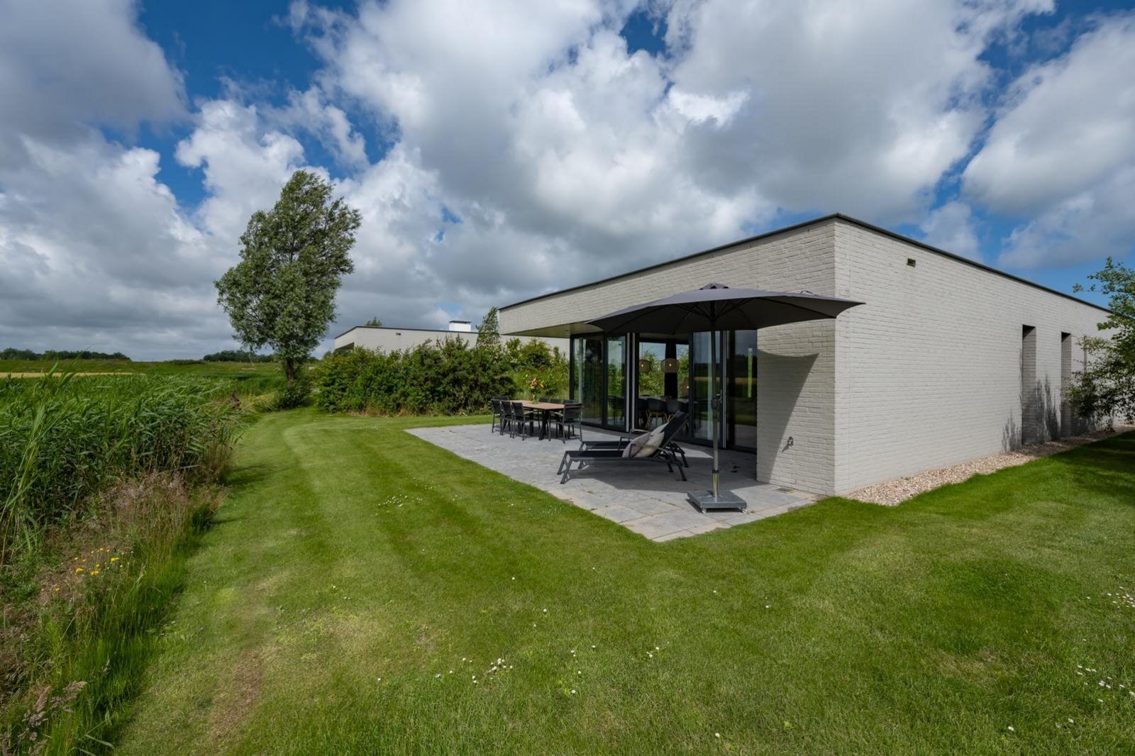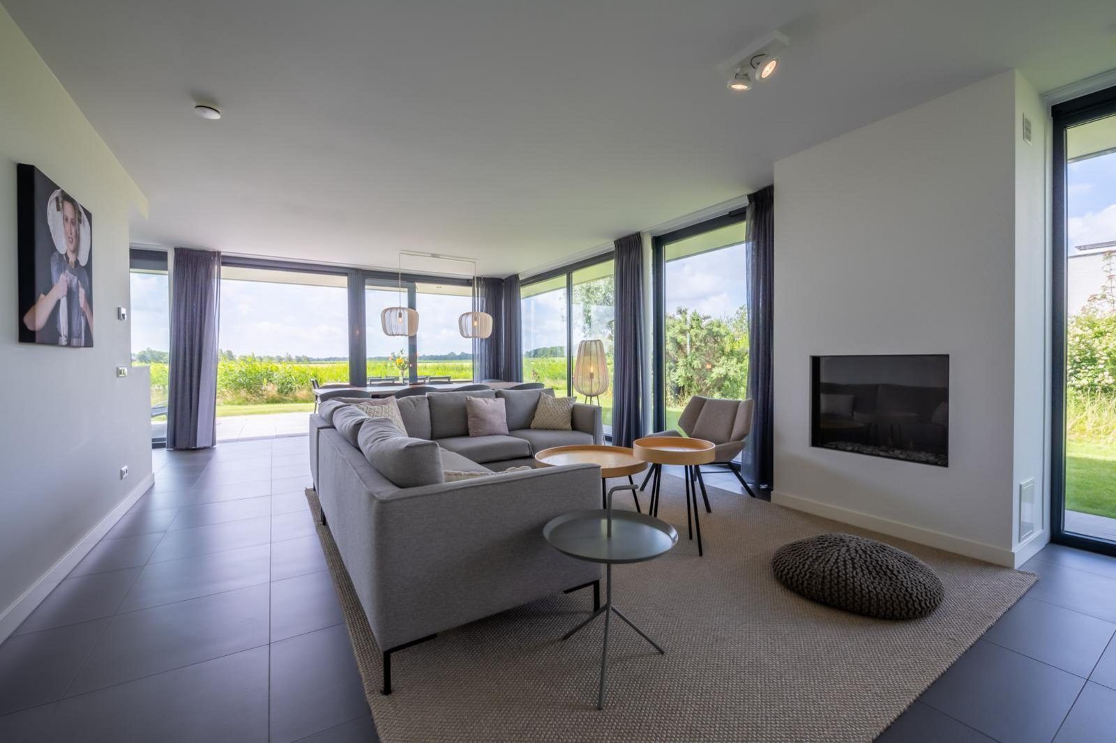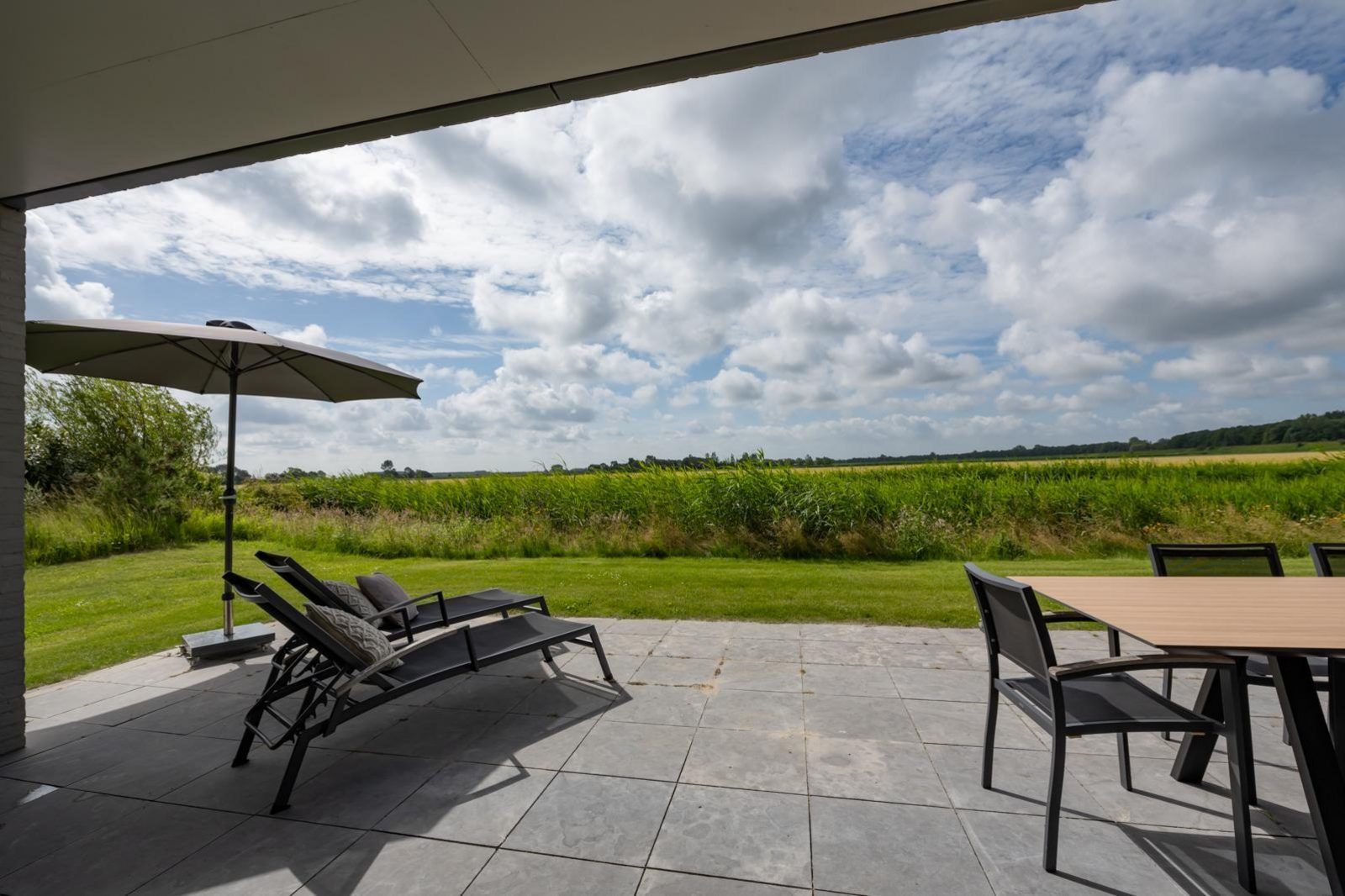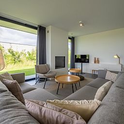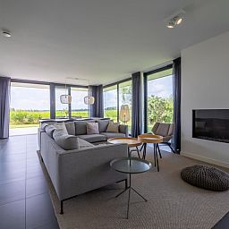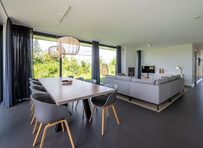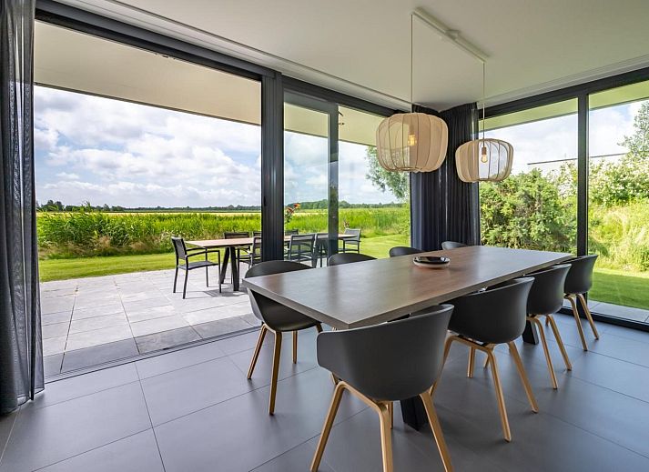 L'atmosphère de la salle de séjour est merveilleusement lumineuse et la façade vitrée sur toute la largeur de la salle de séjour (fenêtres allant du sol au plafond) vous donne une vue panoramique sur le vaste paysage des polders. Les doubles portes de jardin permettent de relier de manière optimale le salon au jardin. En plus d'une grande table à manger, il y a un généreux coin salon avec télévision à écran plat avec bouquet étranger et une cheminée à gaz atmosphérique. La luxueuse cuisine ouverte est entièrement équipée d'appareils modernes de qualité, tels qu'un four, un micro-ondes, un lave-vaisselle et une machine Nespresso.