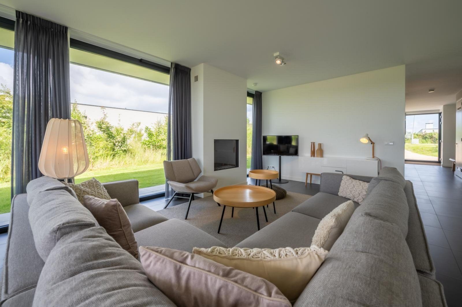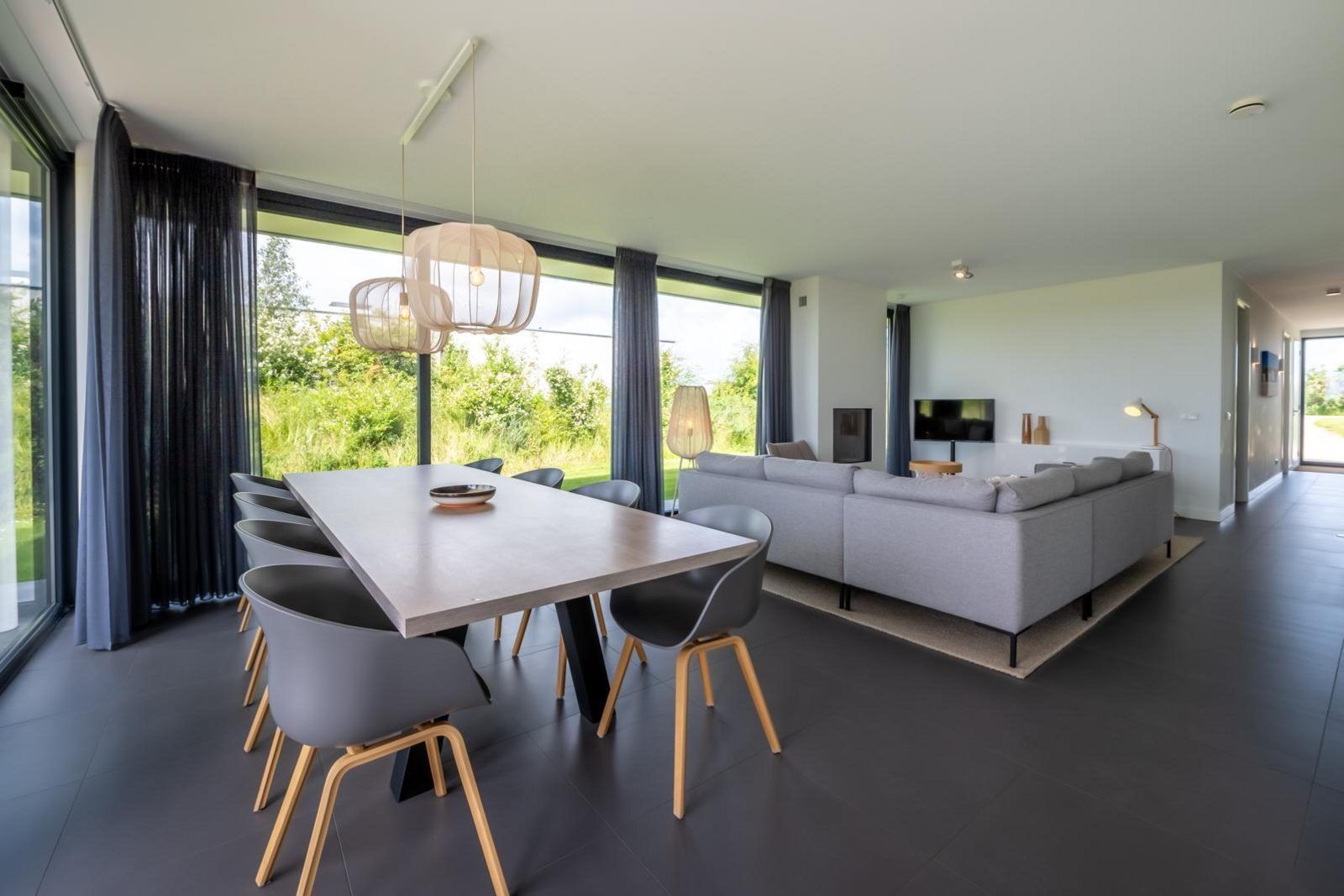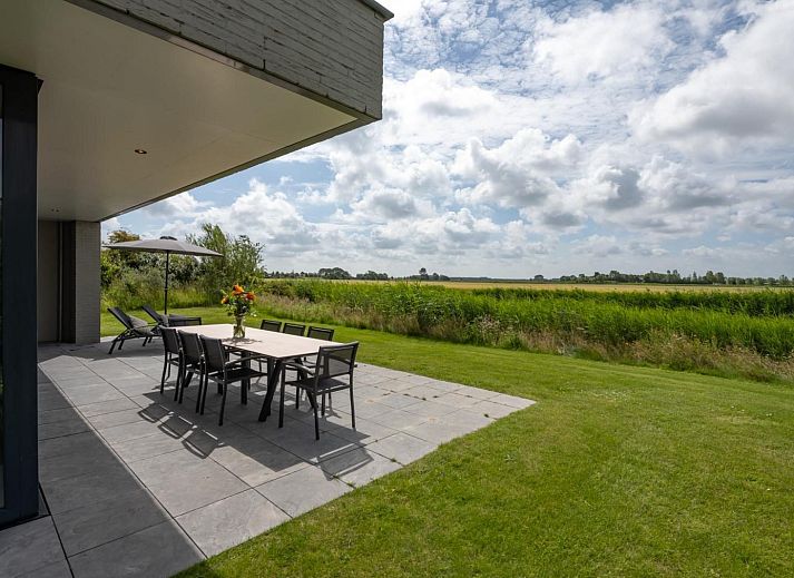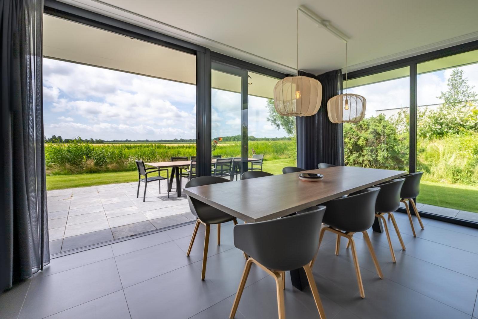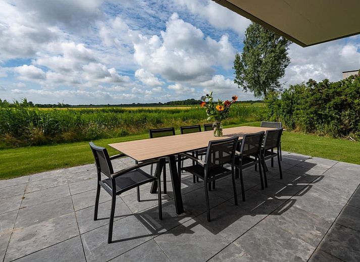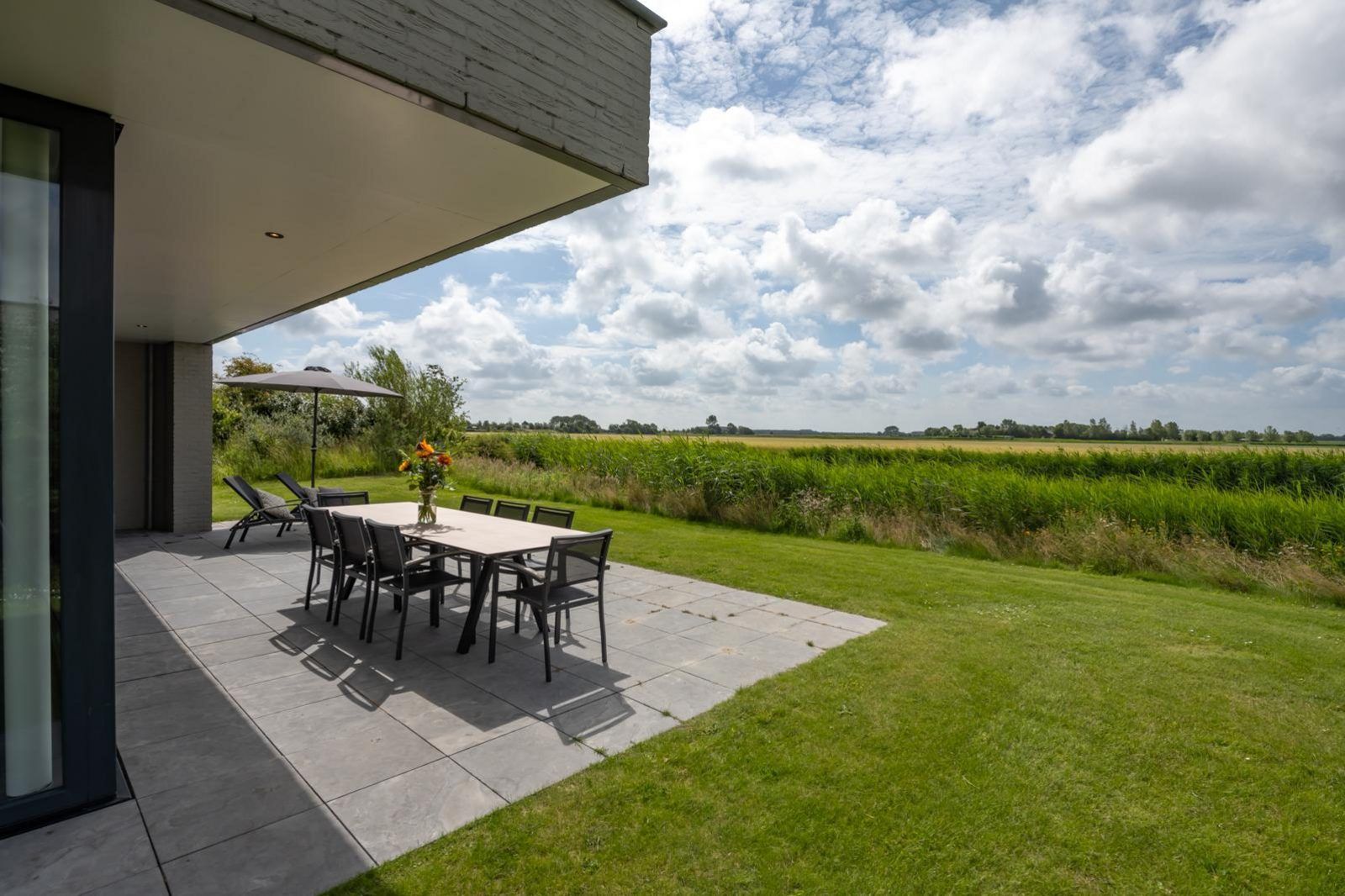 L'atmosphère de la salle de séjour est merveilleusement lumineuse et la façade vitrée sur toute la largeur de la salle de séjour (fenêtres allant du sol au plafond) vous donne une vue panoramique sur le vaste paysage des polders. Les doubles portes de jardin permettent de relier de manière optimale le salon au jardin. En plus d'une grande table à manger, il y a un généreux coin salon avec télévision à écran plat avec bouquet étranger et une cheminée à gaz atmosphérique. La luxueuse cuisine ouverte est entièrement équipée d'appareils modernes de qualité, tels qu'un four, un micro-ondes, un lave-vaisselle et une machine Nespresso.