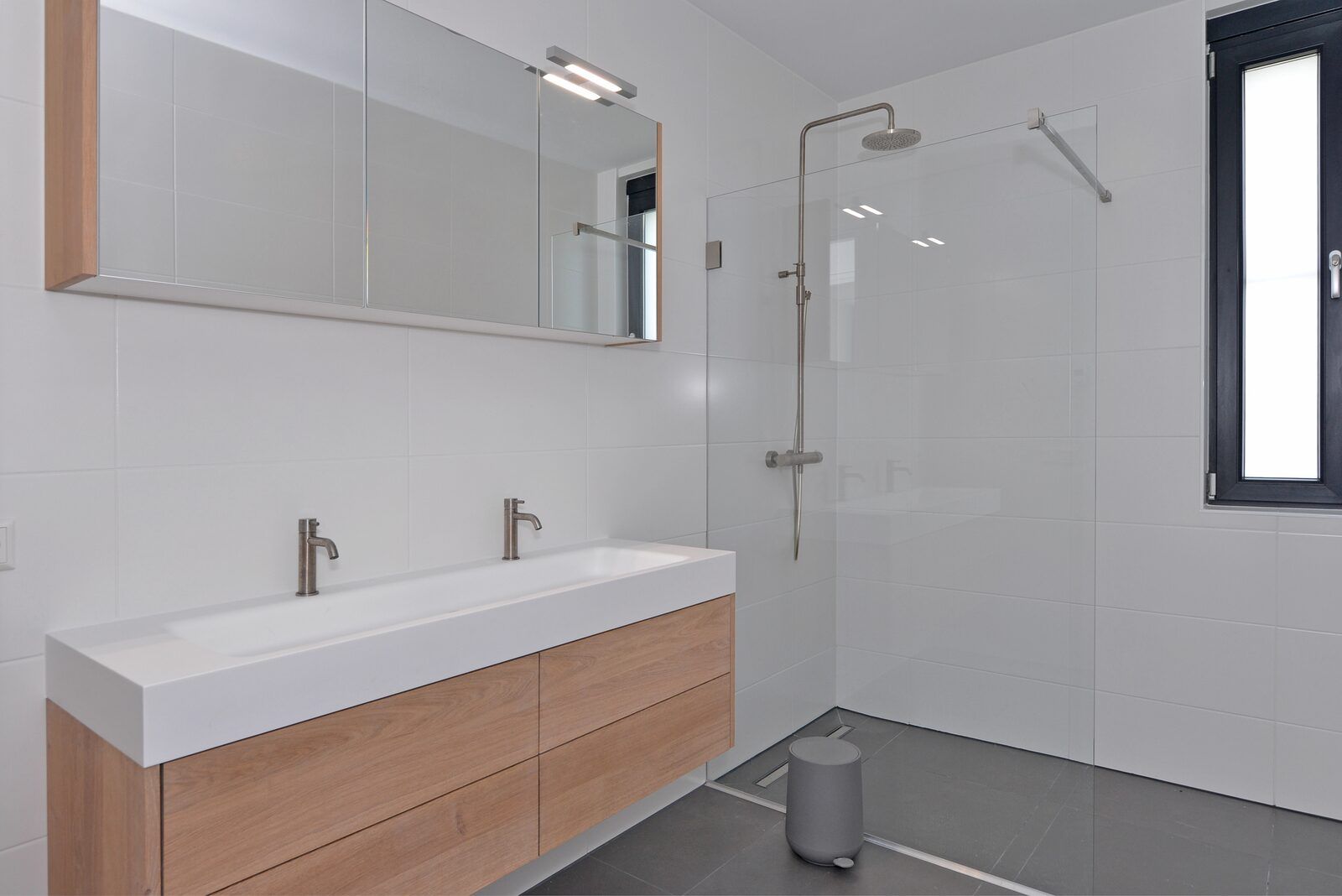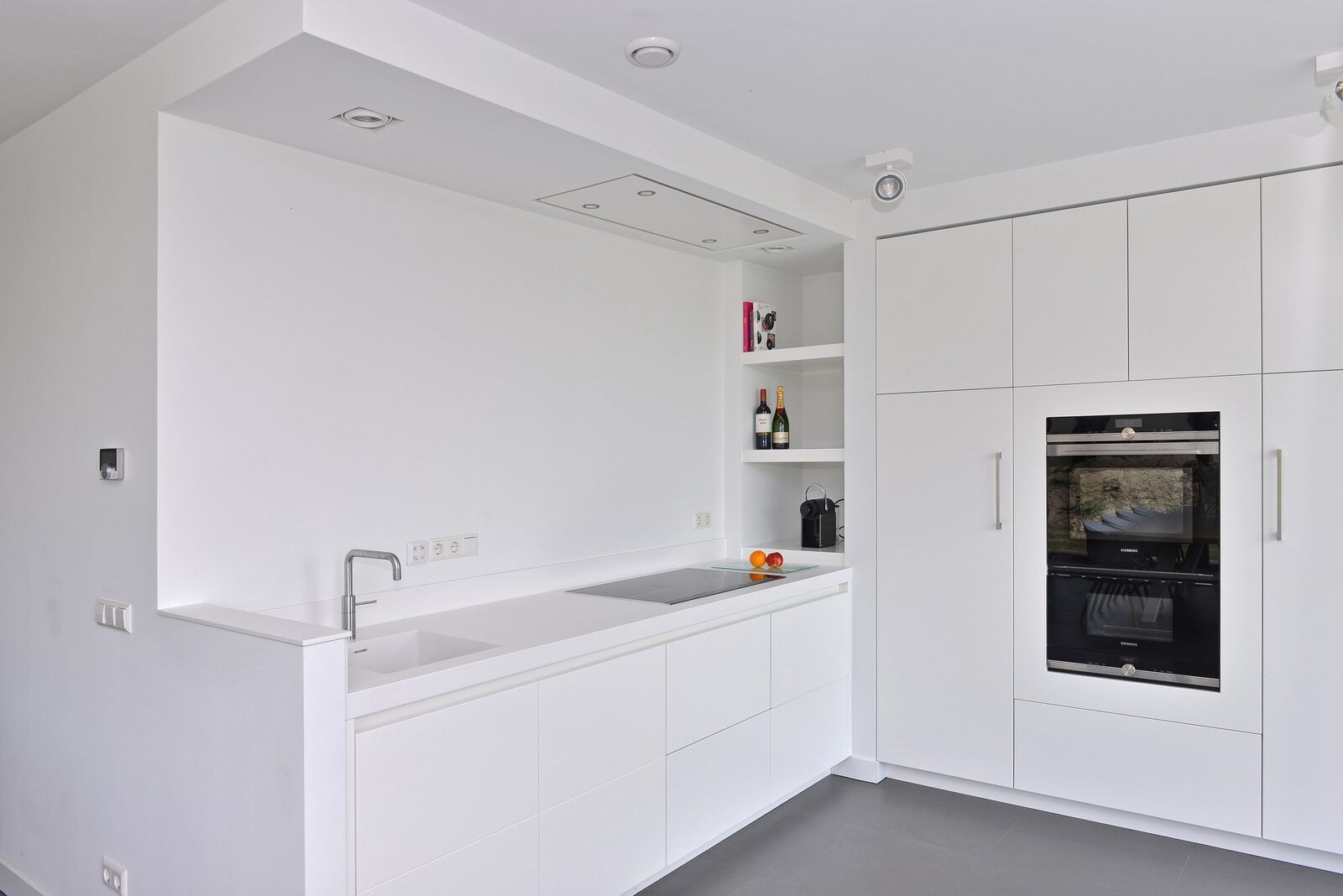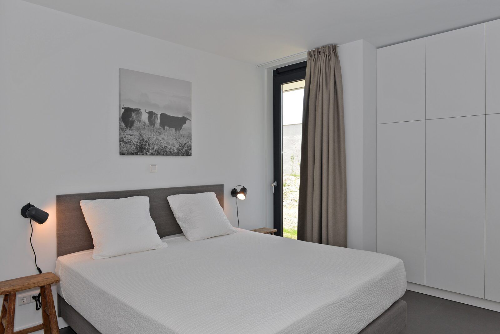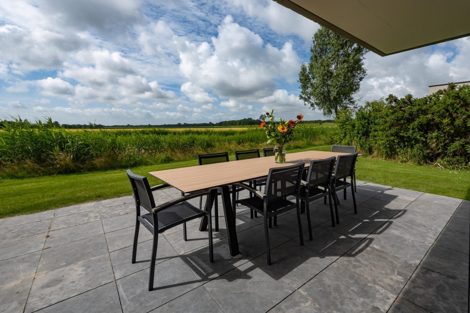 L'atmosphère de la salle de séjour est merveilleusement lumineuse et la façade vitrée sur toute la largeur de la salle de séjour (fenêtres allant du sol au plafond) vous donne une vue panoramique sur le vaste paysage des polders. Les doubles portes de jardin permettent de relier de manière optimale le salon au jardin. En plus d'une grande table à manger, il y a un généreux coin salon avec télévision à écran plat avec bouquet étranger et une cheminée à gaz atmosphérique. La luxueuse cuisine ouverte est entièrement équipée d'appareils modernes de qualité, tels qu'un four, un micro-ondes, un lave-vaisselle et une machine Nespresso.