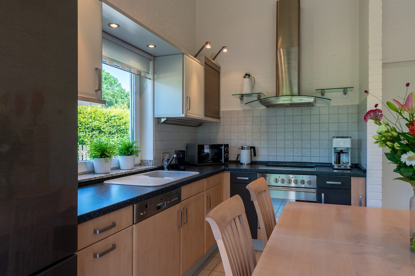 Depuis le hall, vous avez accès au salon confortable équipé d'une télévision à écran plat avec télévision numérique et Google Chromecast. La façade vitrée du salon offre beaucoup de lumière naturelle et les portes de jardin pliantes offrent un accès direct au jardin. La cuisine ouverte est équipée d'appareils électroménagers de confort, dont un lave-vaisselle, un grand réfrigérateur-congélateur, un four et un magnétron. Les amateurs de café ne sont pas en reste, puisque vous disposez d'une cafetière à filtre et d'une machine à café Nespresso. Une machine à laver et un sèche-linge se trouvent dans le local de rangement.