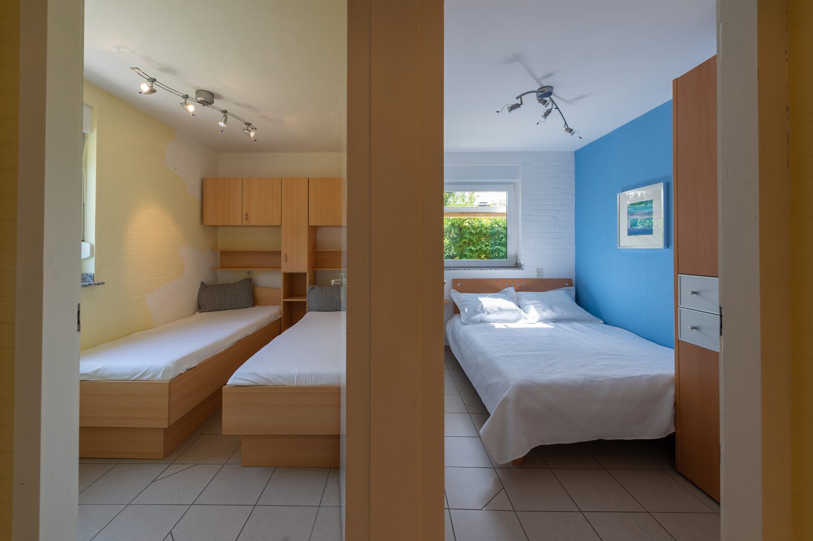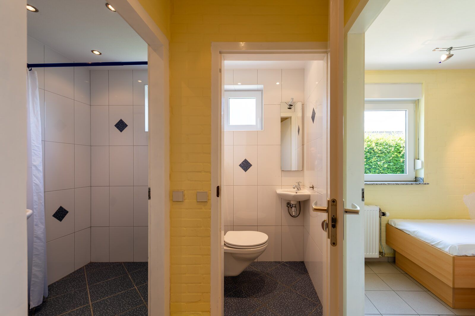 Depuis le salon, vous avez accès à éél'une des trois chambres. La chambre est équipée d'un lit double, d'une grande armoire et de beaucoup de lumière naturelle. Depuis le hall, vous pouvez accéder aux deux autres chambres, à la salle de bains et aux toilettes pour invités. Une chambre dispose de deux lits simples, l'autre chambre dispose d'un (petit) lit double. La salle de bain est équipée d'une douche et d'un lavabo.