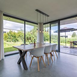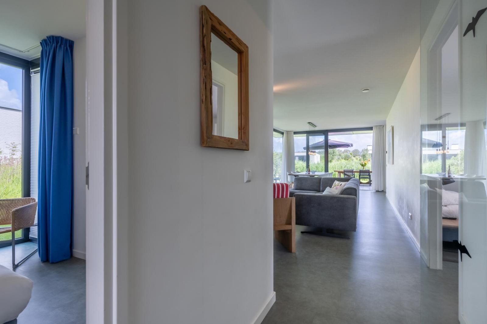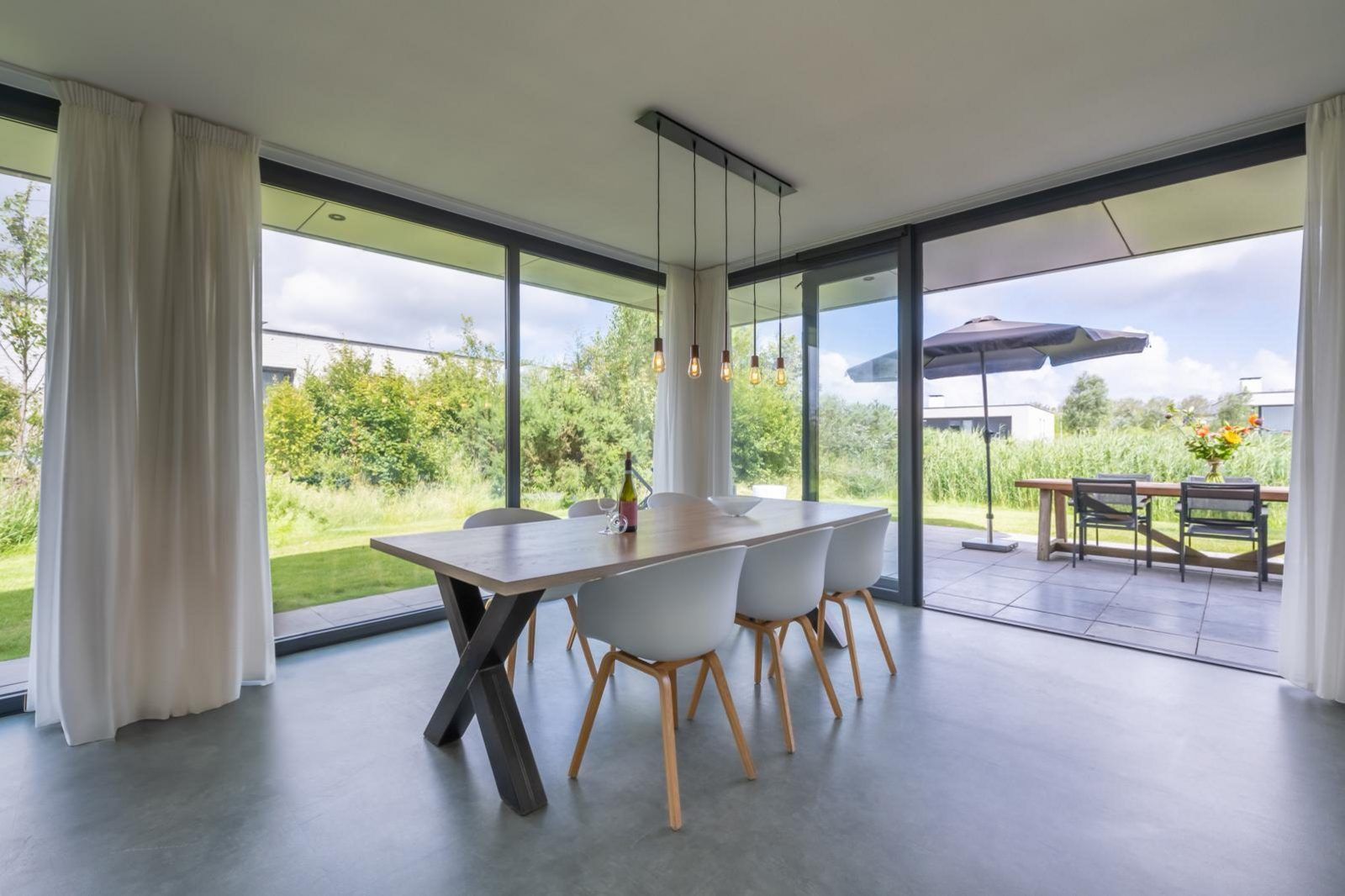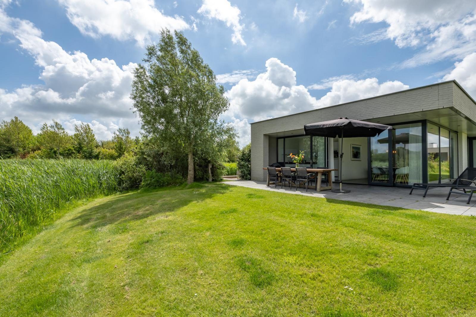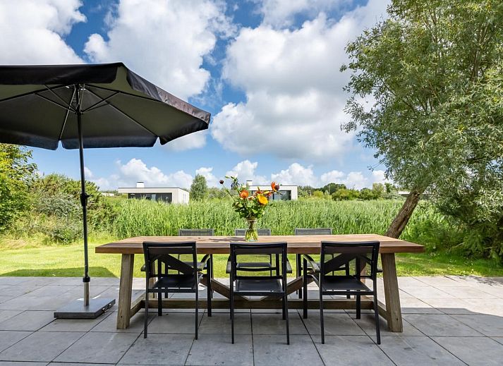 Lorsque vous ouvrez les portes du jardin dans le salon sur la terrasse merveilleusement ensoleillée et spacieuse, vous pouvez immédiatement profiter de l'extérieur. Vous y trouverez une grande table à manger etdeux chaises longues confortables. Le jardin spacieux borde un étang et est entouré de pentes, d'herbe de plage et de broussailles de dunes.