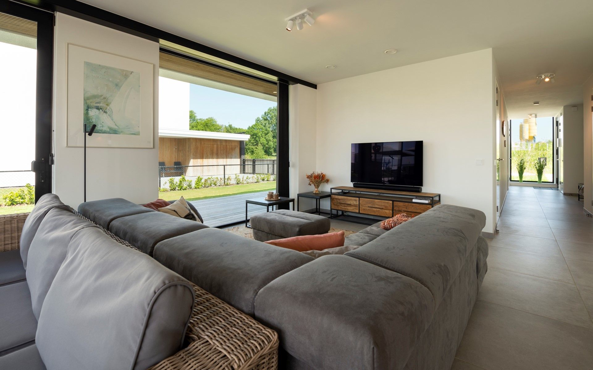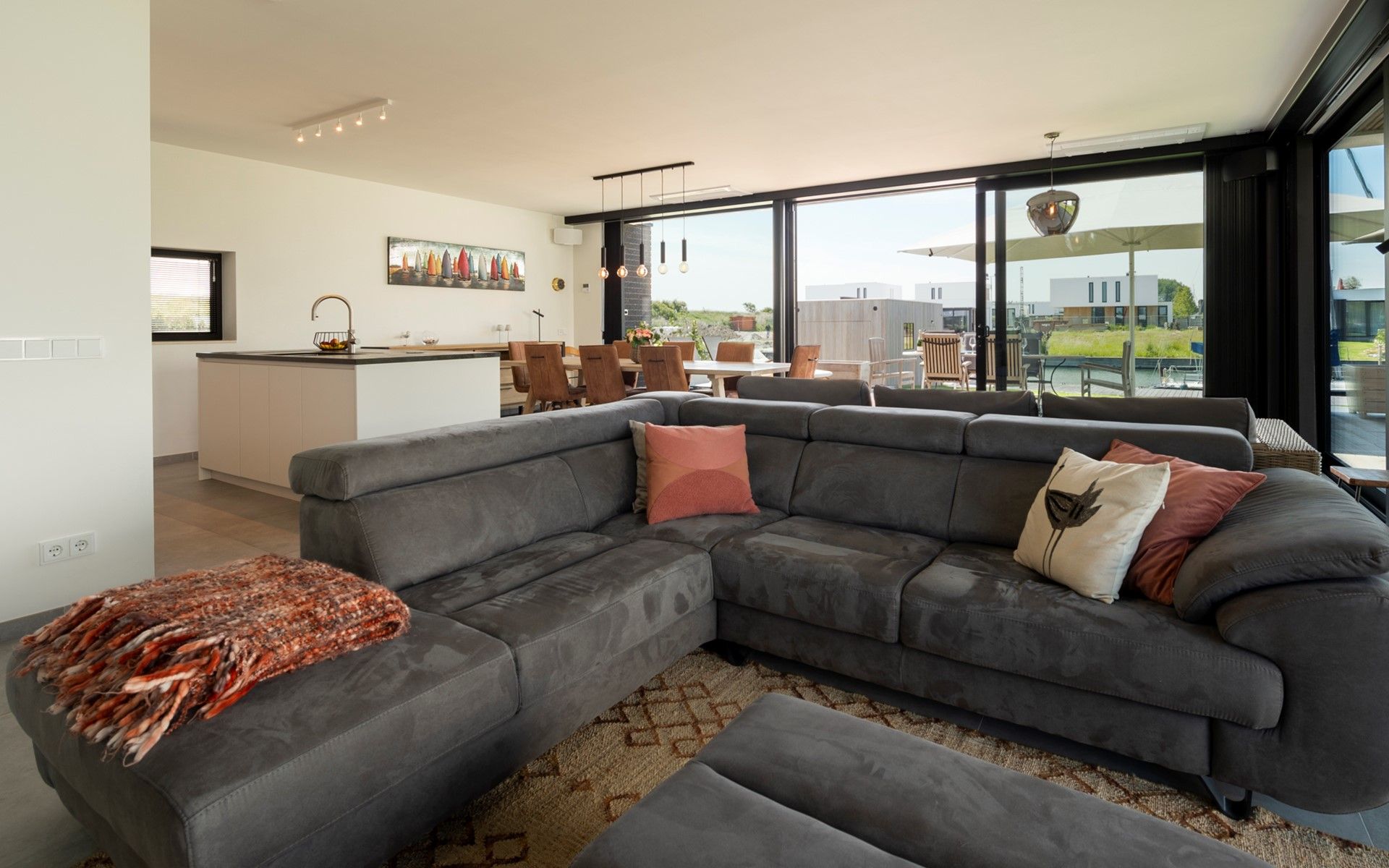 La maison dispose d'un espace de vie très spacieux avec de grandes fenêtres et des portes coulissantes pour profiter pleinement de la nature environnante et des bateaux qui passent. Les enfants ont également été pris en compte. Le salon dispose d'un tapis douillet où ils peuvent s'amuser en toute tranquillité.