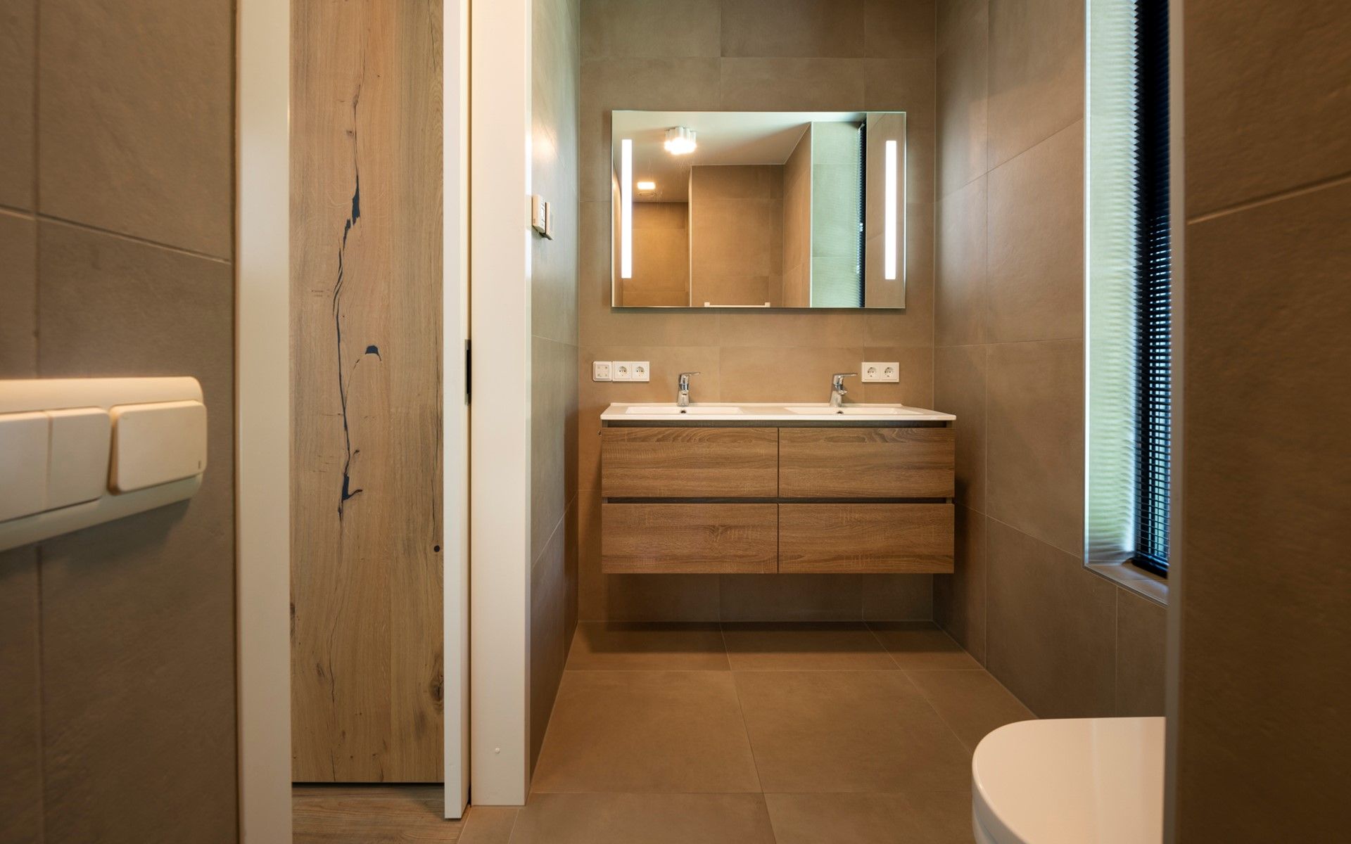 Cette maison de plain-pied dispose également de 3 chambres à coucher, de 2 salles de bains avec douche à l'italienne, d'un WC séparé et d'une grande terrasse avec pelouse, exposée au sud-ouest.